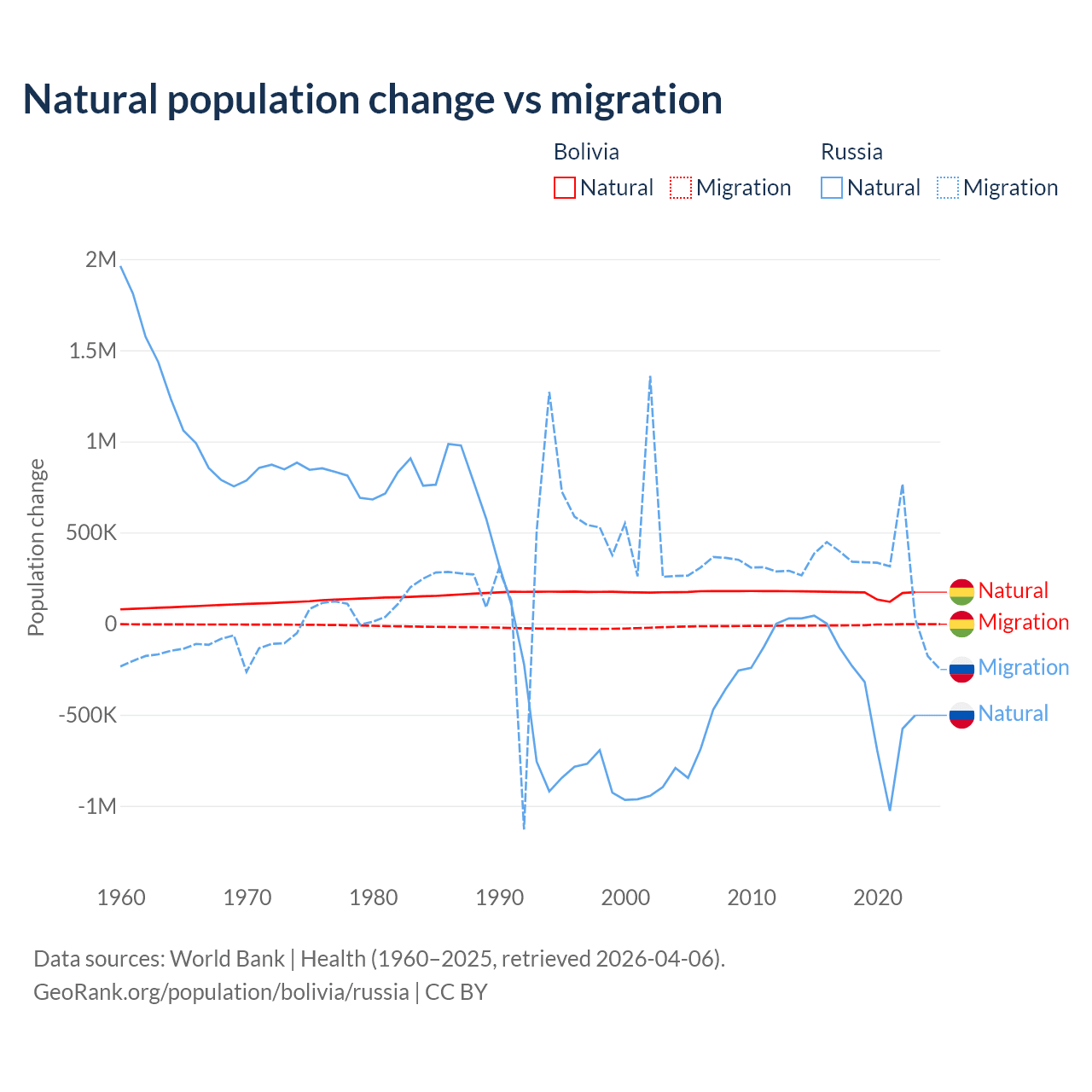 Over the last 10 years, 95.6% of the population change in Bolivia is from natural causes (a gain of 1,637,833 people) and 4.37% is from migration (a loss of 74,903 people). In Russia 48.6% is from natural causes (a loss of 3,416,377 people) and 51.4% is from migration (a gain of 3,611,826 people).