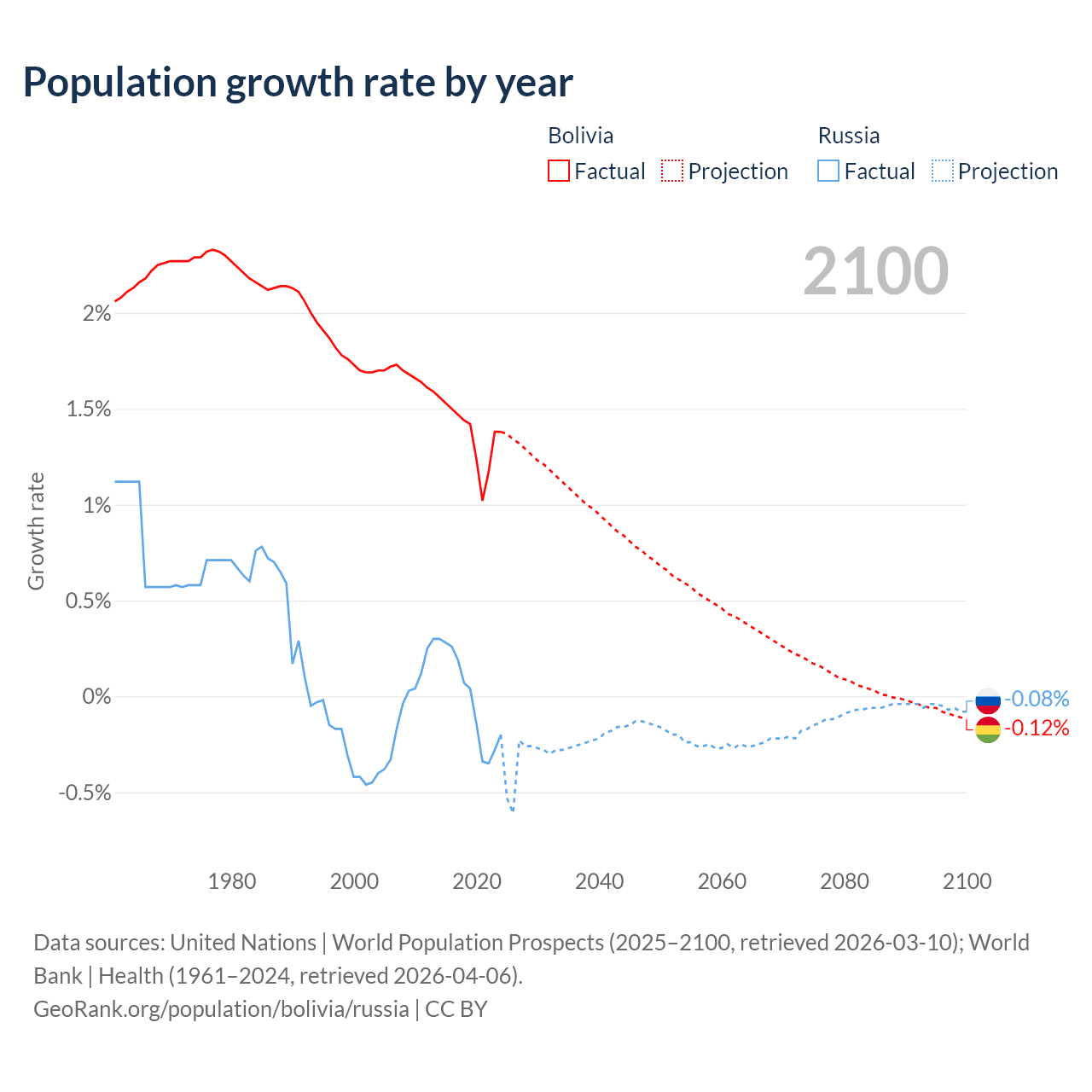 - For the last 10 years, Bolivia has had an average growth rate of +1.37% per year vs -0.02% in Russia.