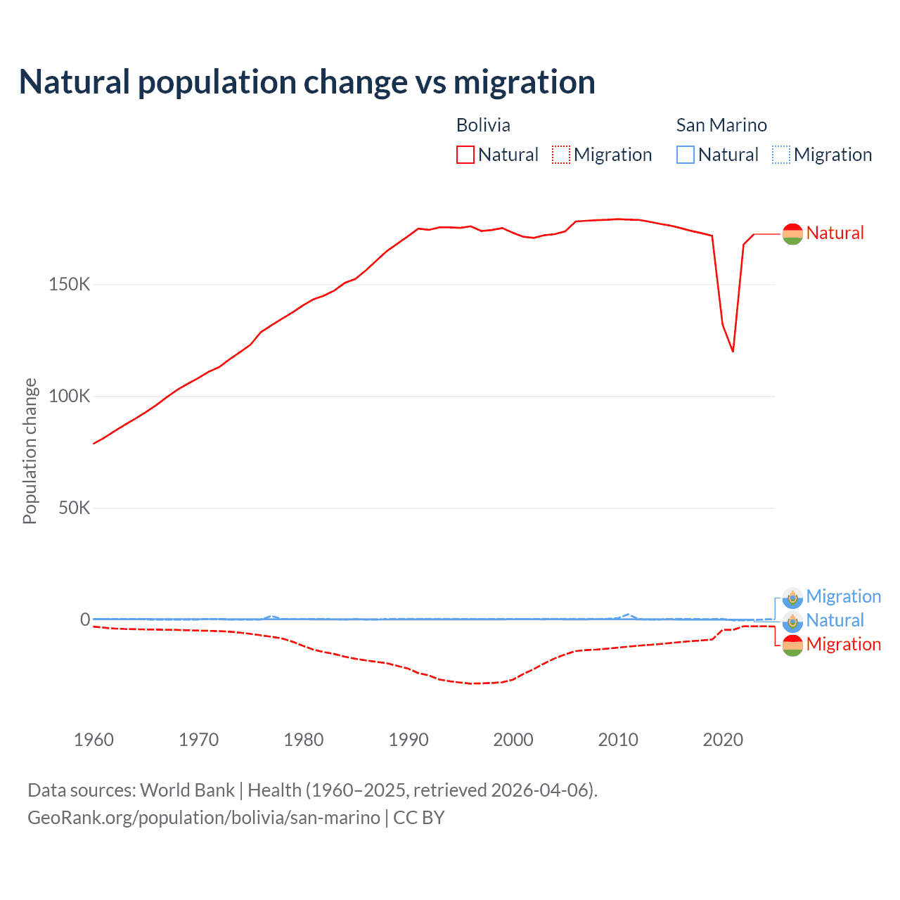 Over the last 10 years, 95.6% of the population change in Bolivia is from natural causes (a gain of 1,637,833 people) and 4.37% is from migration (a loss of 74,903 people). In San Marino 40.9% is from natural causes (a loss of 358 people) and 59.1% is from migration (a gain of 517 people).