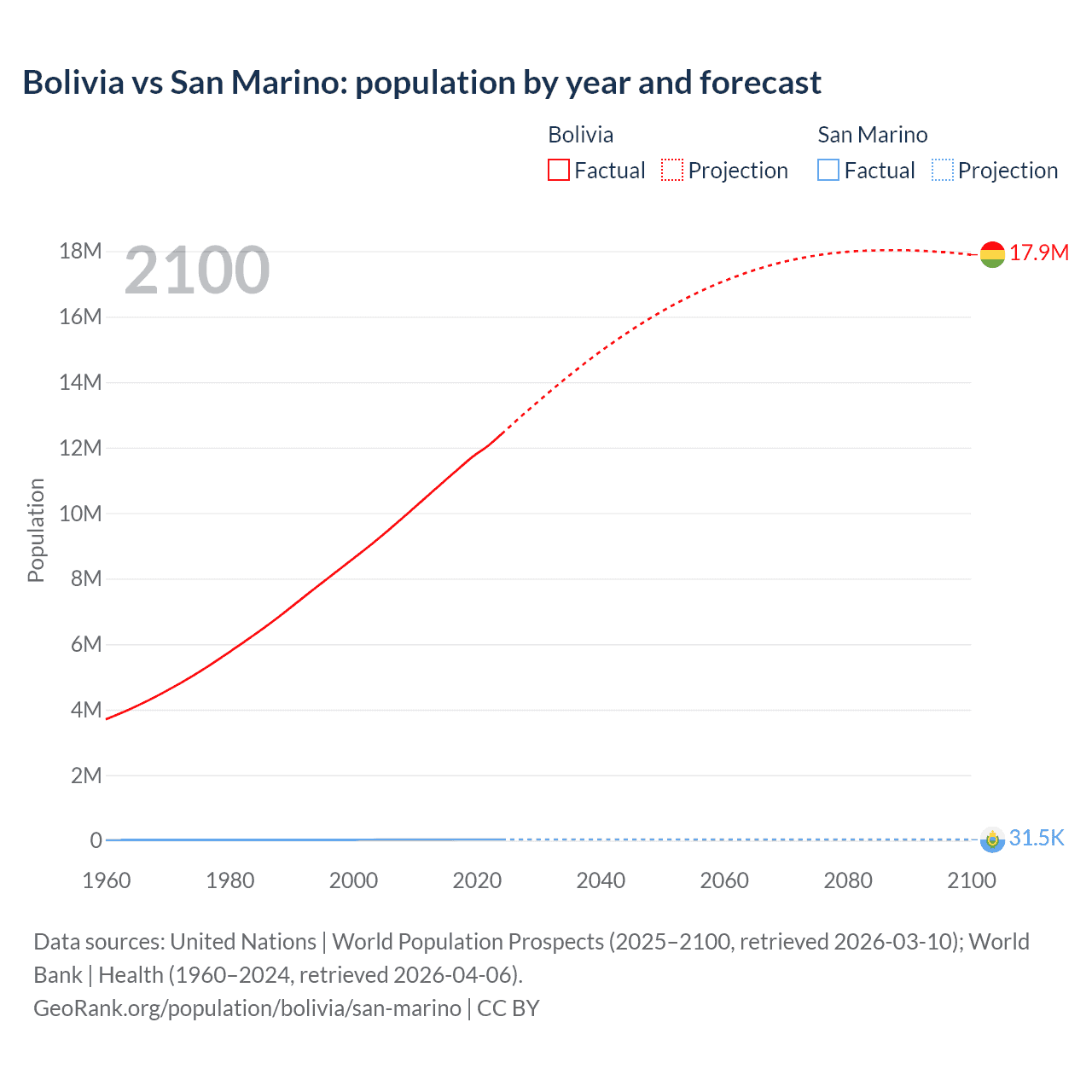 The latest officially reported population of Bolivia was 12,413,315 in 2024 vs 33,977 people in San Marino in 2024. In 2026, based on the adjusted UN estimation, the current Bolivia's population is 12,798,112 people compared to 33,967 in San Marino.
