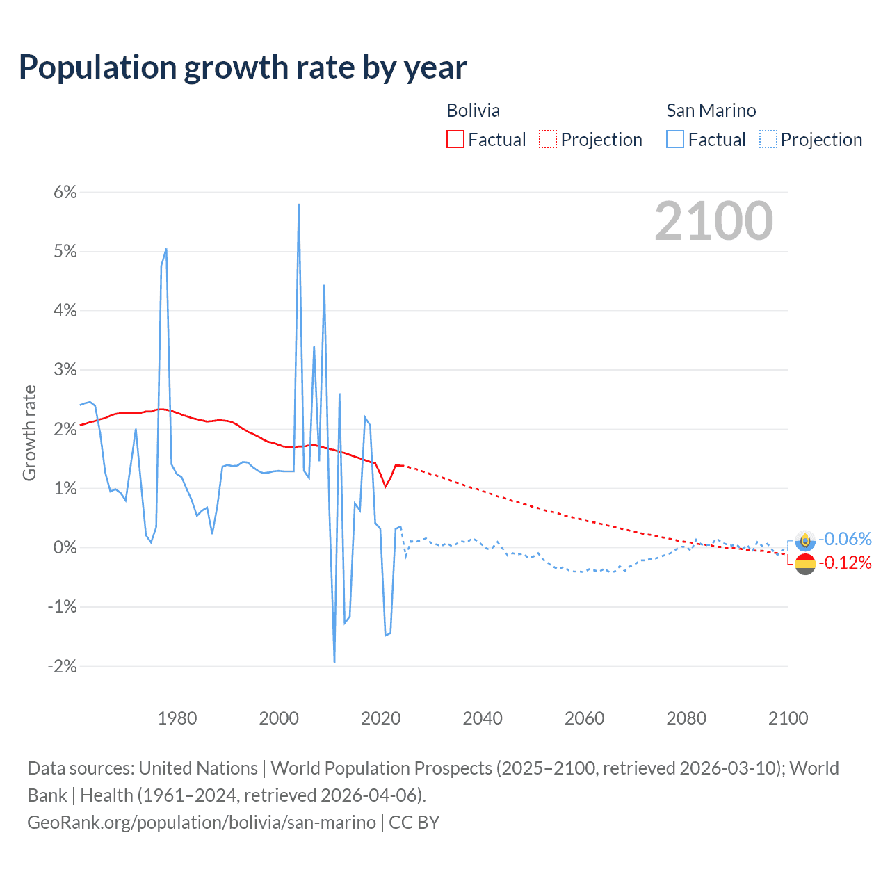 - For the last 10 years, Bolivia has had an average growth rate of +1.37% per year vs +0.26% in San Marino.