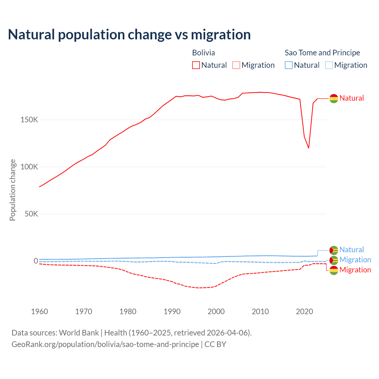 Over the last 10 years, 95.6% of the population change in Bolivia is from natural causes (a gain of 1,637,833 people) and 4.37% is from migration (a loss of 74,903 people). In Sao Tome and Principe 80.1% is from natural causes (a gain of 50,822 people) and 19.9% is from migration (a loss of 12,621 people).