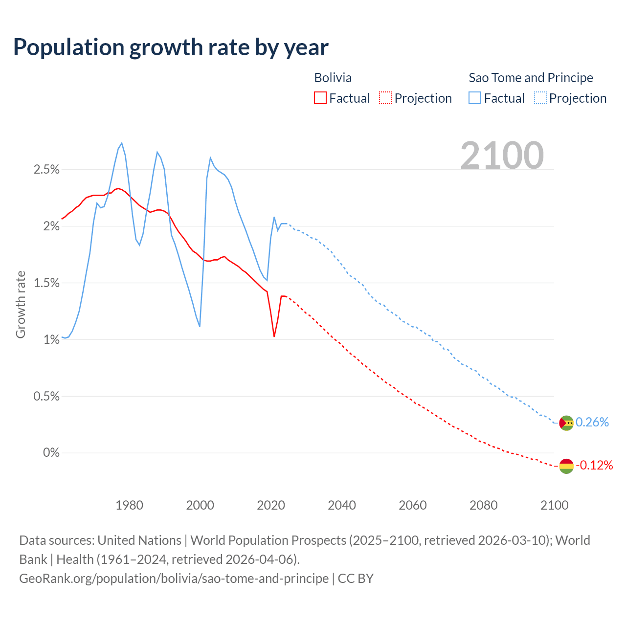 - For the last 10 years, Bolivia has had an average growth rate of +1.37% per year vs +1.82% in Sao Tome and Principe.