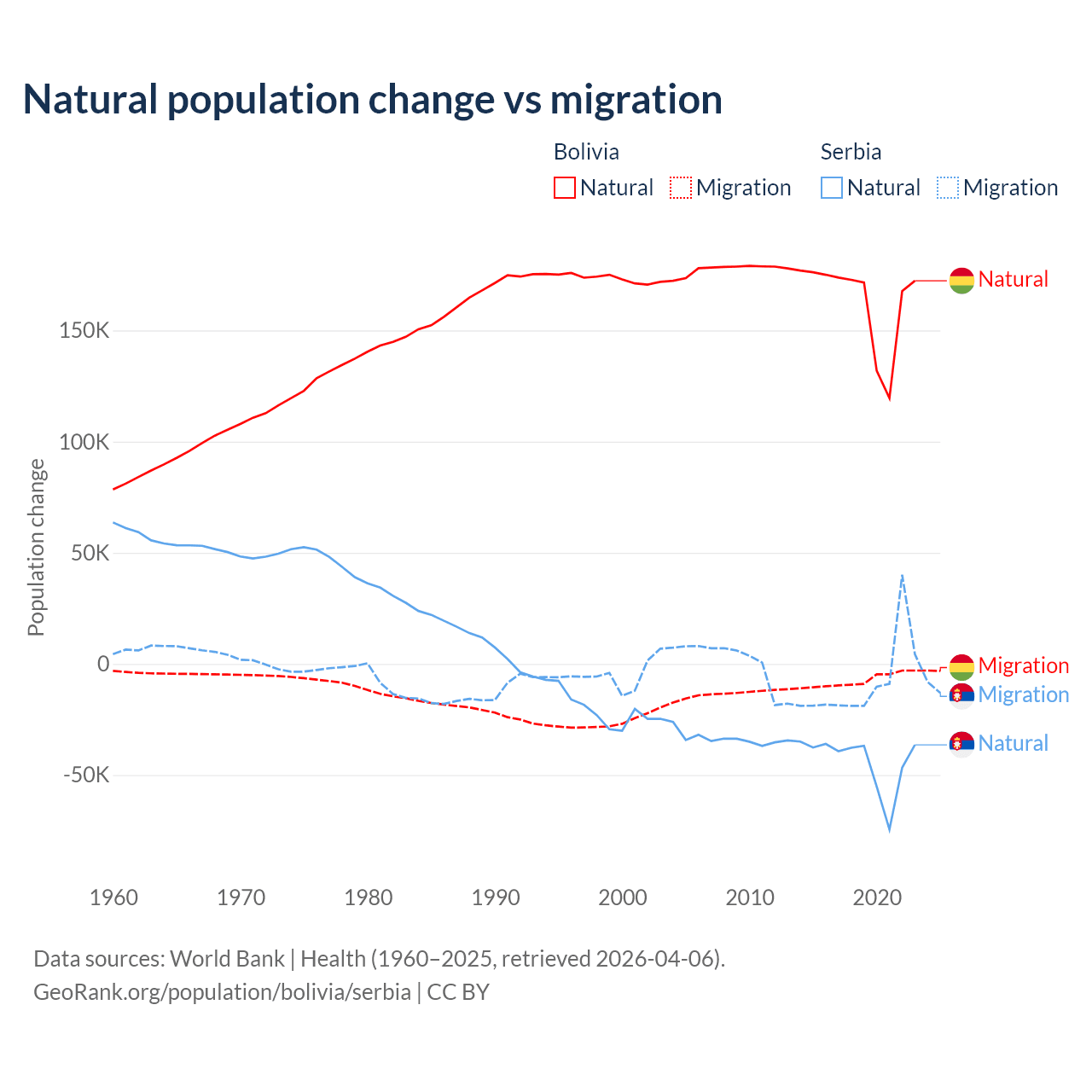 Over the last 10 years, 95.6% of the population change in Bolivia is from natural causes (a gain of 1,637,833 people) and 4.37% is from migration (a loss of 74,903 people). In Serbia 83.3% is from natural causes (a loss of 435,148 people) and 16.7% is from migration (a loss of 87,110 people).