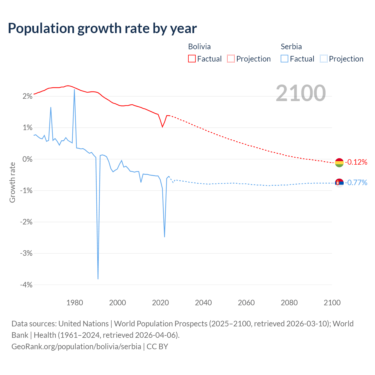 - For the last 10 years, Bolivia has had an average growth rate of +1.37% per year vs -0.76% in Serbia.