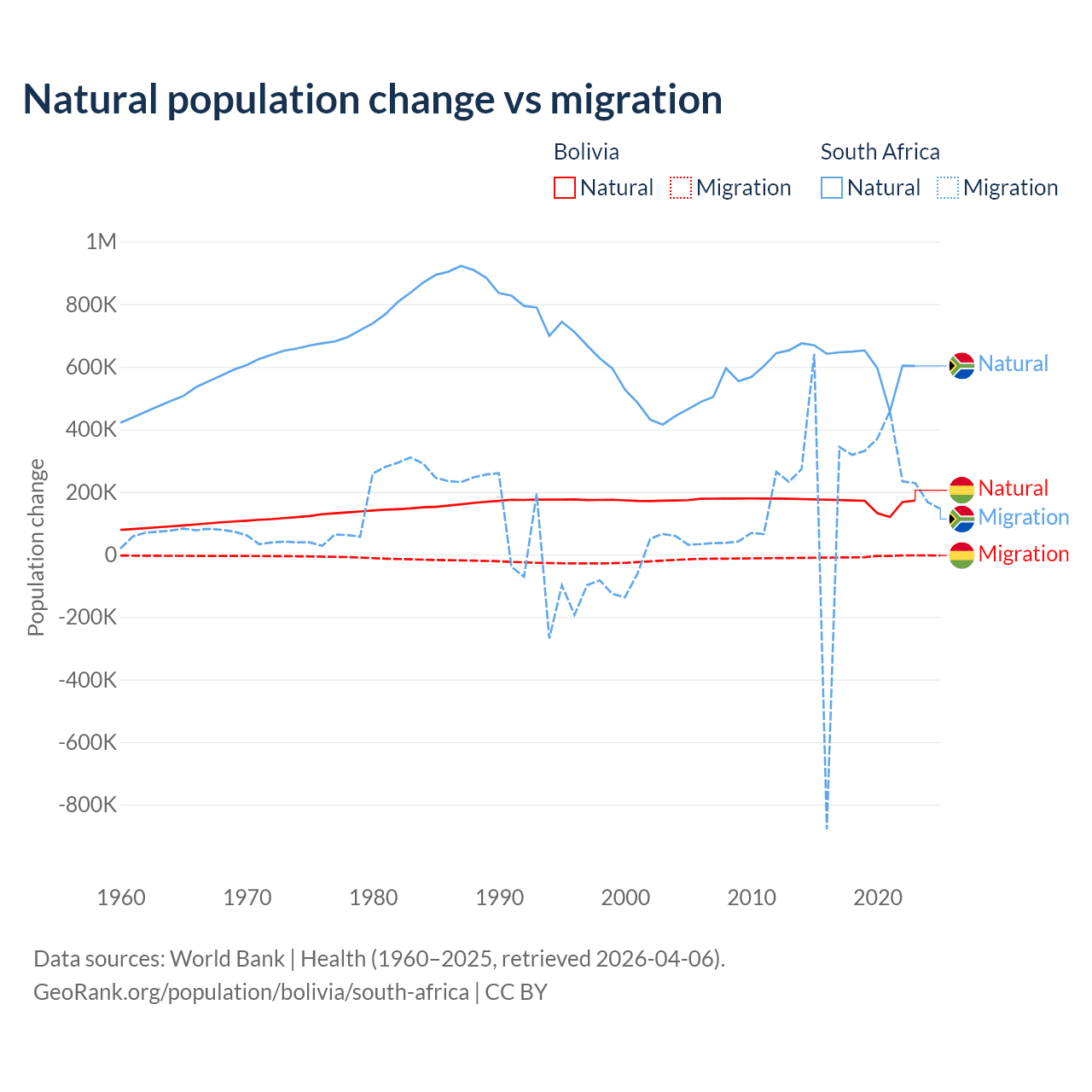 Over the last 10 years, 95.6% of the population change in Bolivia is from natural causes (a gain of 1,637,833 people) and 4.37% is from migration (a loss of 74,903 people). In South Africa 72.8% is from natural causes (a gain of 6,190,027 people) and 27.2% is from migration (a gain of 2,316,795 people).