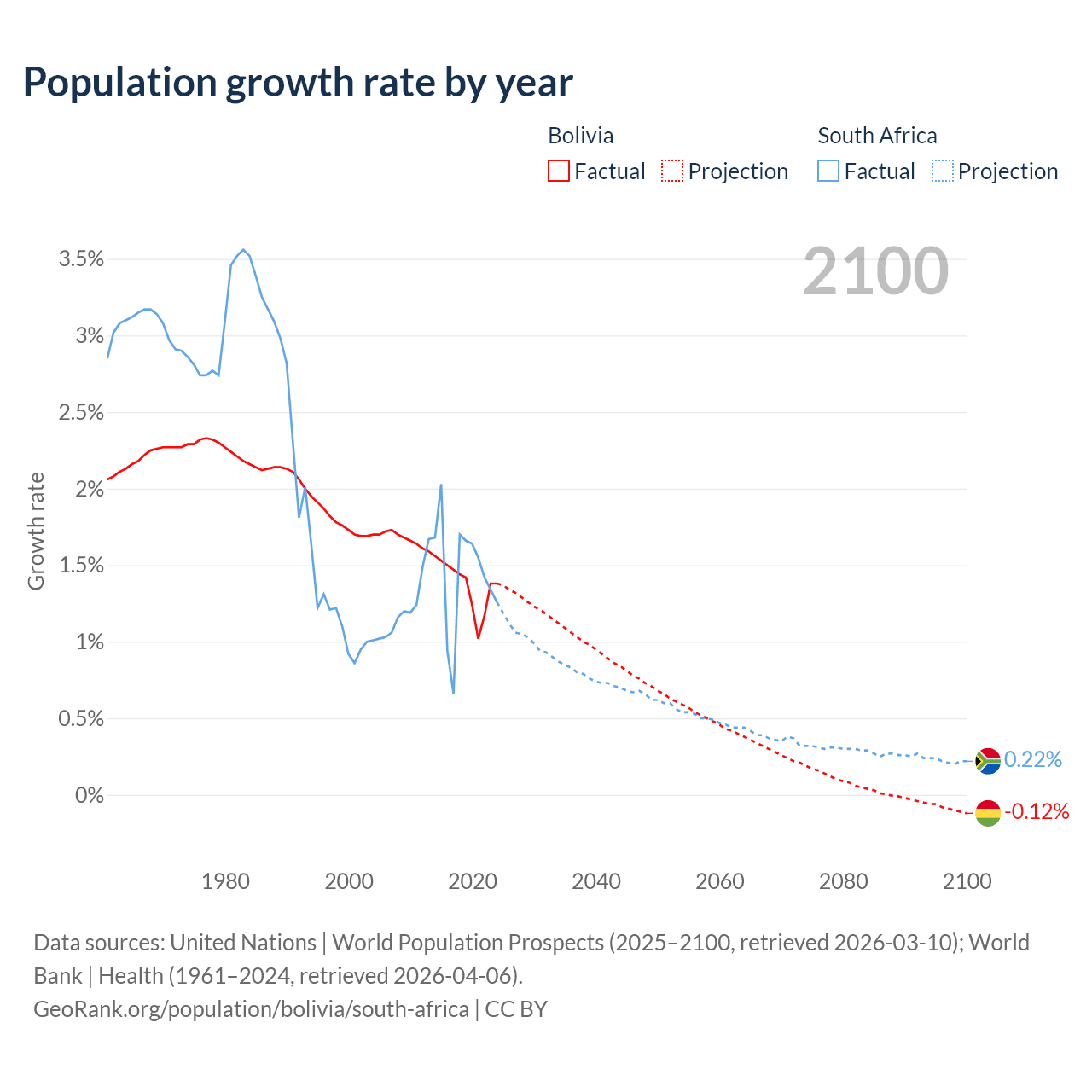 - For the last 10 years, Bolivia has had an average growth rate of +1.37% per year vs +1.44% in South Africa.