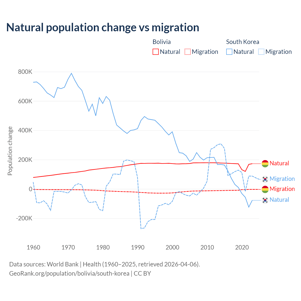 Over the last 10 years, 95.6% of the population change in Bolivia is from natural causes (a gain of 1,637,833 people) and 4.37% is from migration (a loss of 74,903 people). In South Korea 17.6% is from natural causes (a gain of 277,215 people) and 82.4% is from migration (a gain of 1,298,356 people).
