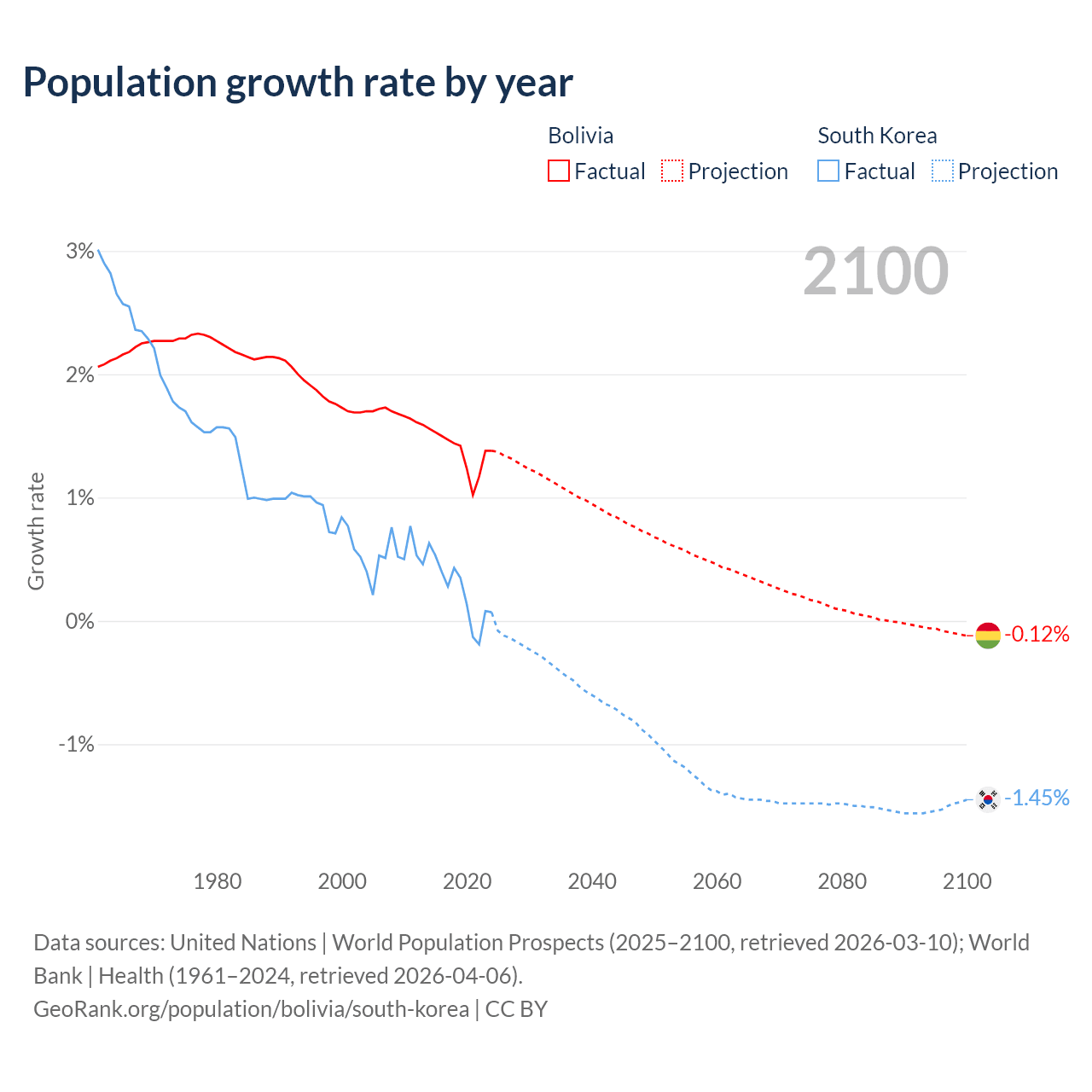 - For the last 10 years, Bolivia has had an average growth rate of +1.37% per year vs +0.24% in South Korea.