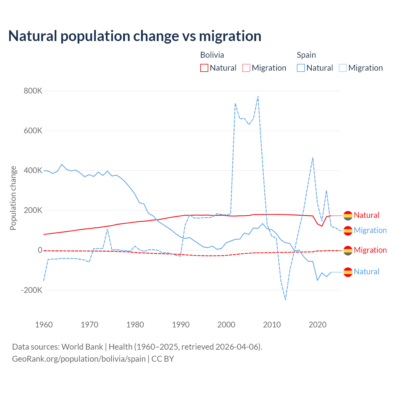 Over the last 10 years, 95.6% of the population change in Bolivia is from natural causes (a gain of 1,637,833 people) and 4.37% is from migration (a loss of 74,903 people). In Spain 25.8% is from natural causes (a loss of 627,829 people) and 74.2% is from migration (a gain of 1,810,127 people).