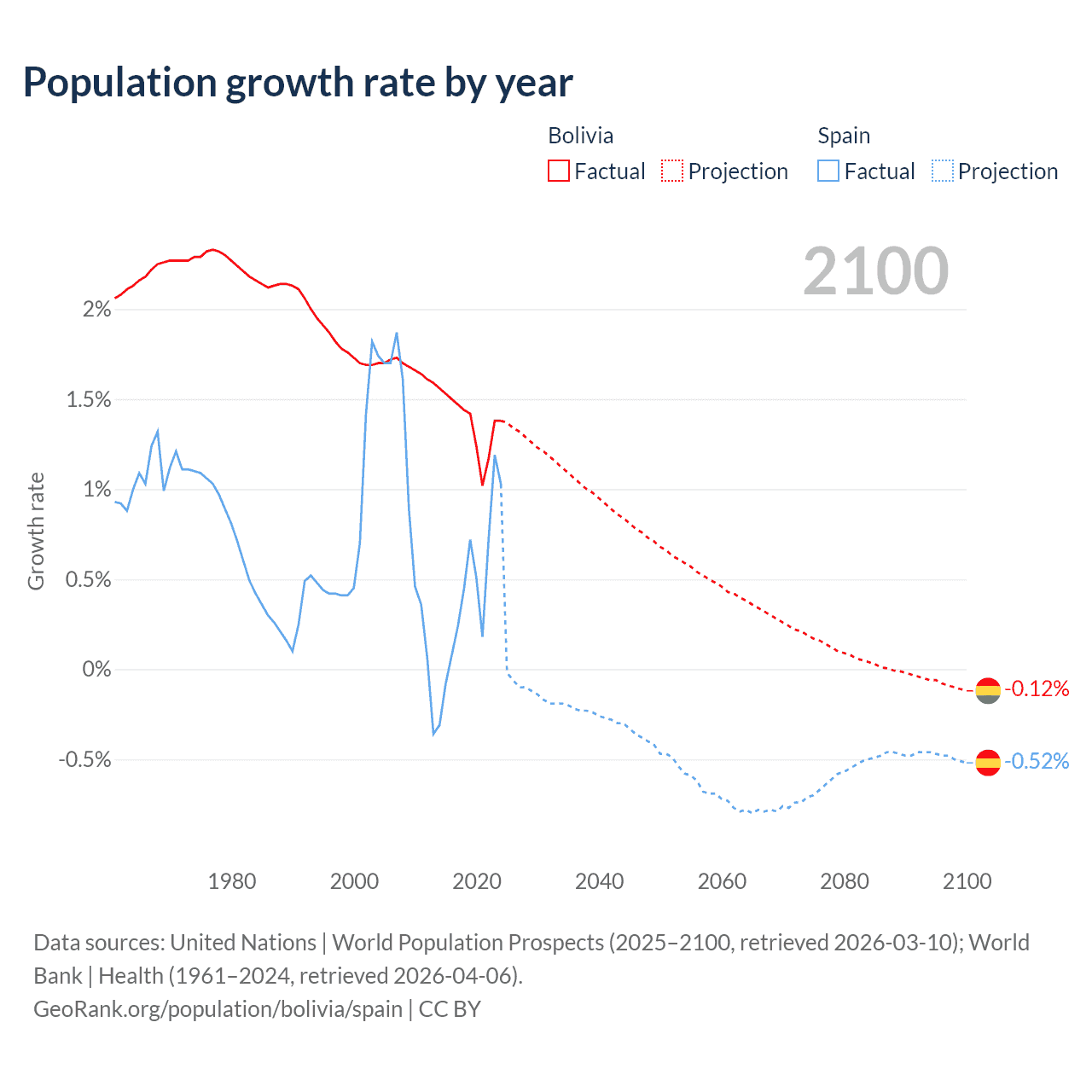 - For the last 10 years, Bolivia has had an average growth rate of +1.37% per year vs +0.43% in Spain.