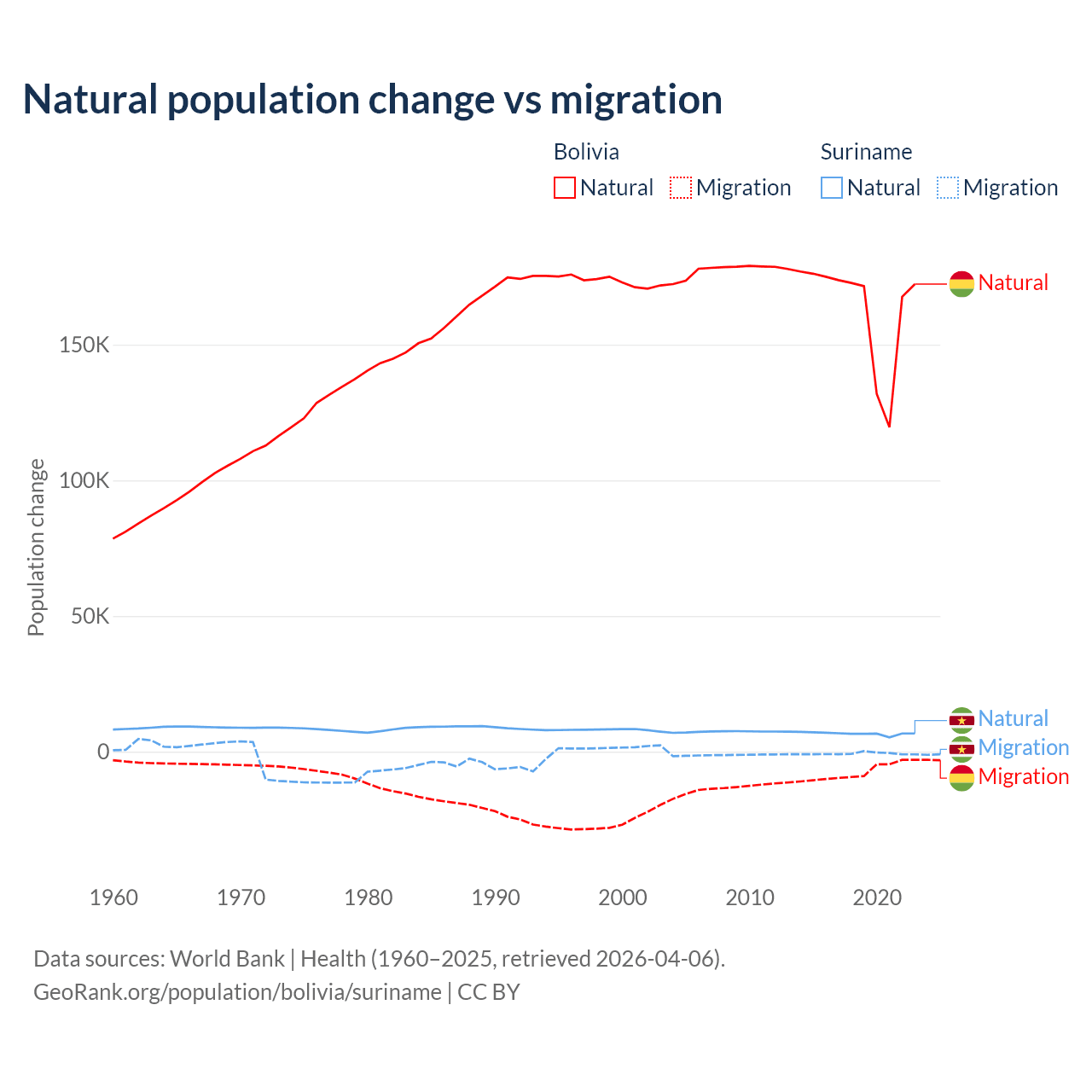 Over the last 10 years, 95.6% of the population change in Bolivia is from natural causes (a gain of 1,637,833 people) and 4.37% is from migration (a loss of 74,903 people). In Suriname 90.3% is from natural causes (a gain of 66,709 people) and 9.72% is from migration (a loss of 7,185 people).