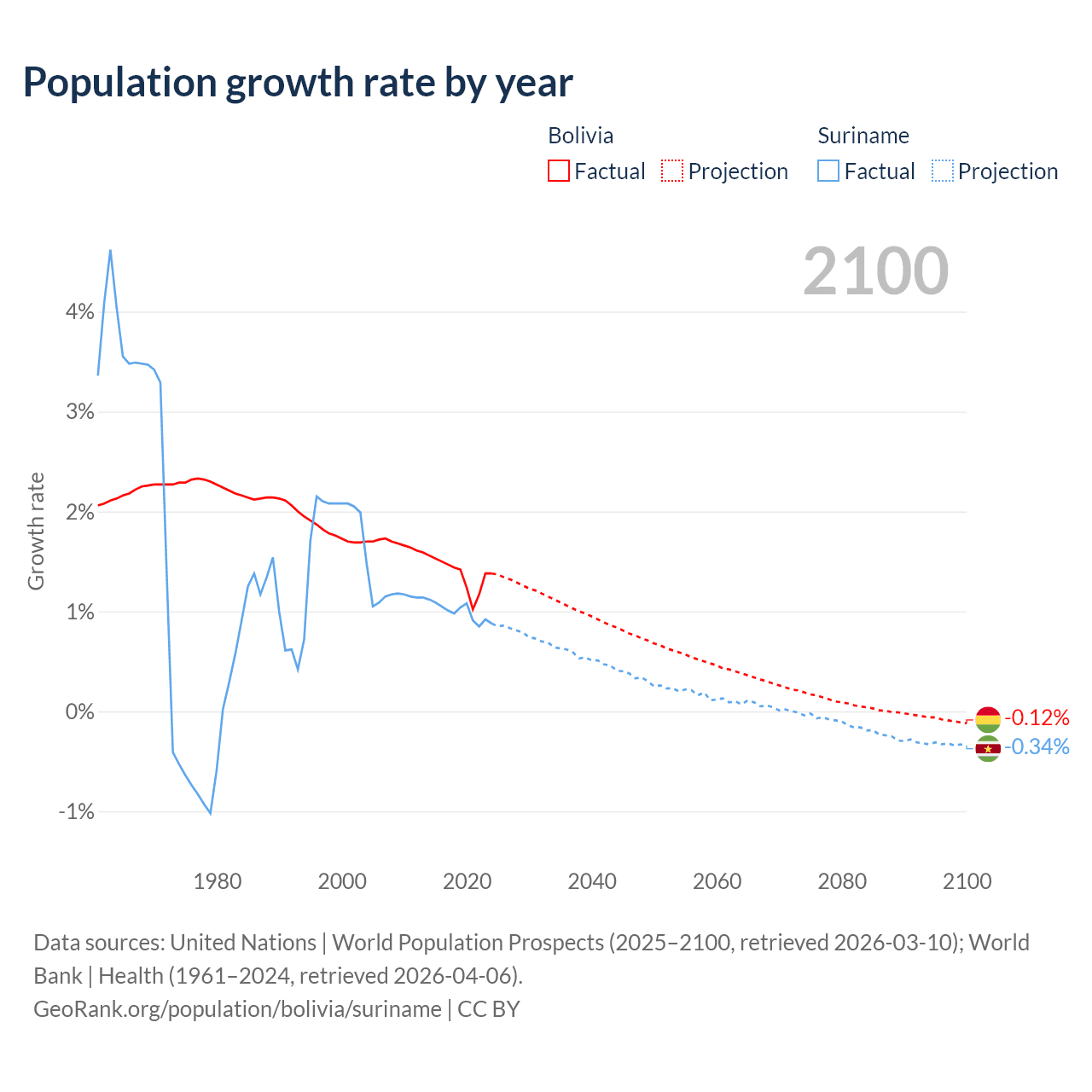 - For the last 10 years, Bolivia has had an average growth rate of +1.37% per year vs +0.99% in Suriname.