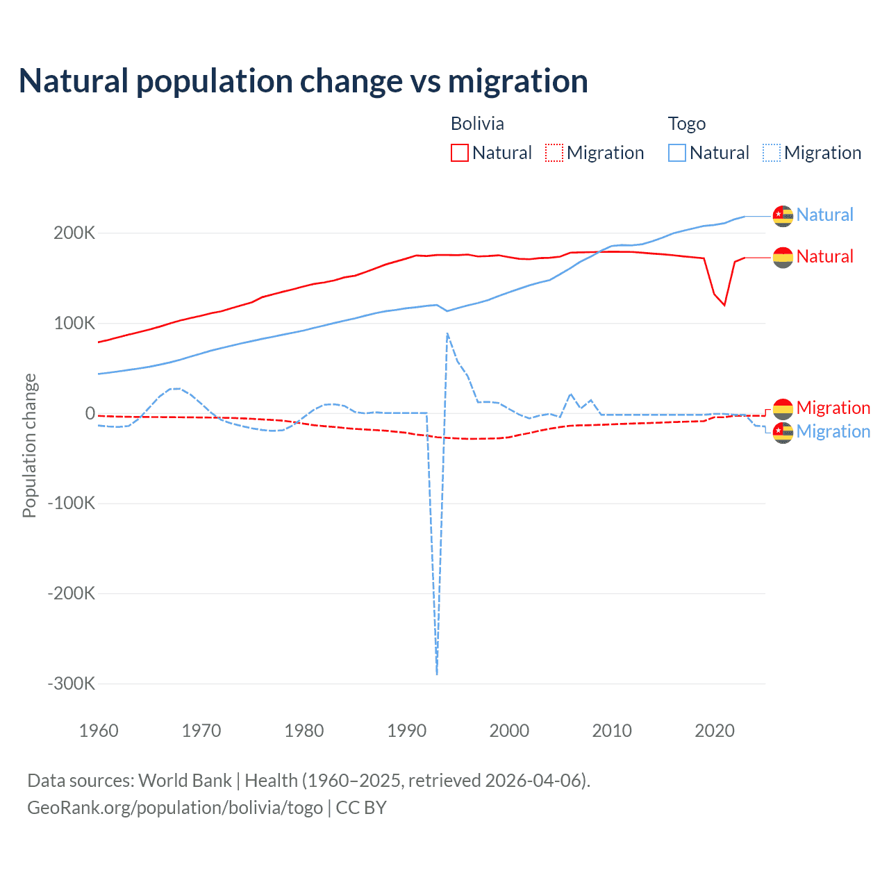 Over the last 10 years, 95.6% of the population change in Bolivia is from natural causes (a gain of 1,637,833 people) and 4.37% is from migration (a loss of 74,903 people). In Togo 99.1% is from natural causes (a gain of 2,052,115 people) and 0.86% is from migration (a loss of 17,852 people).