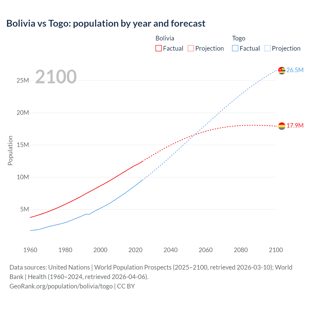 Bolivia vs Togo: population by year and forecast