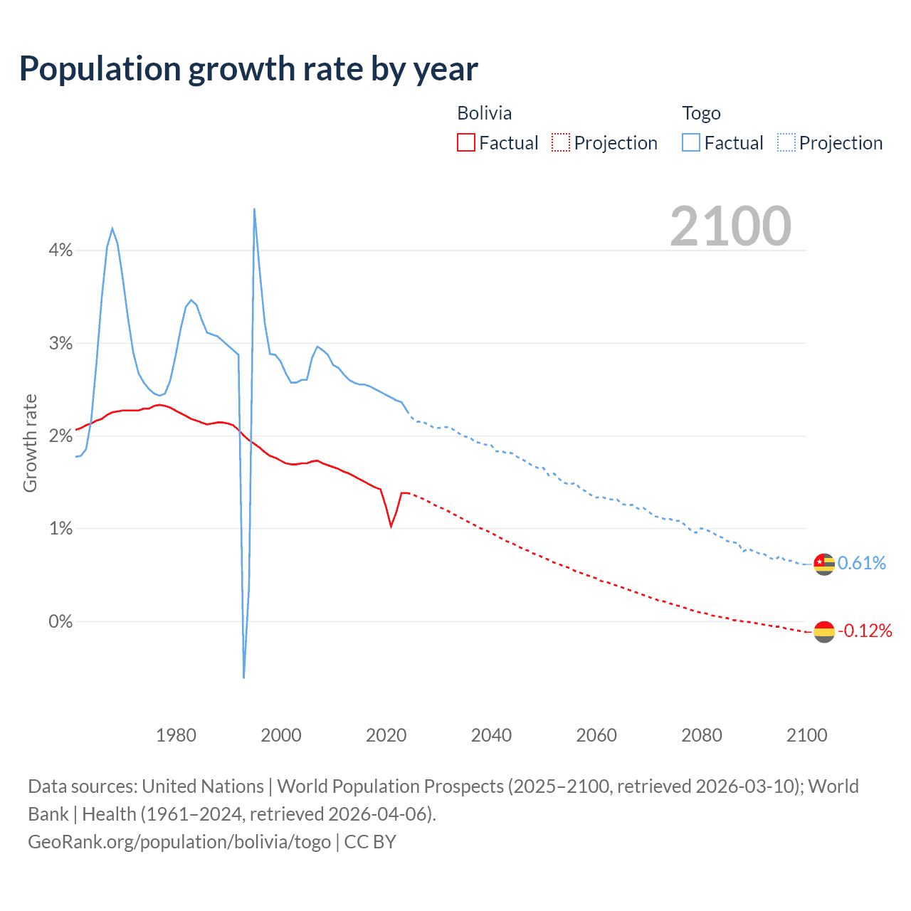 - For the last 10 years, Bolivia has had an average growth rate of +1.37% per year vs +2.46% in Togo.
