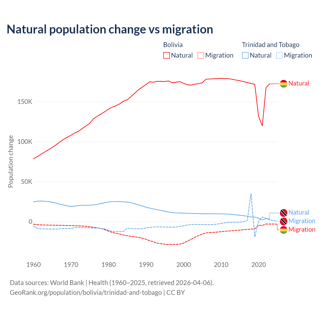 Over the last 10 years, 95.6% of the population change in Bolivia is from natural causes (a gain of 1,637,833 people) and 4.37% is from migration (a loss of 74,903 people). In Trinidad and Tobago 66% is from natural causes (a gain of 55,887 people) and 34% is from migration (a gain of 28,785 people).