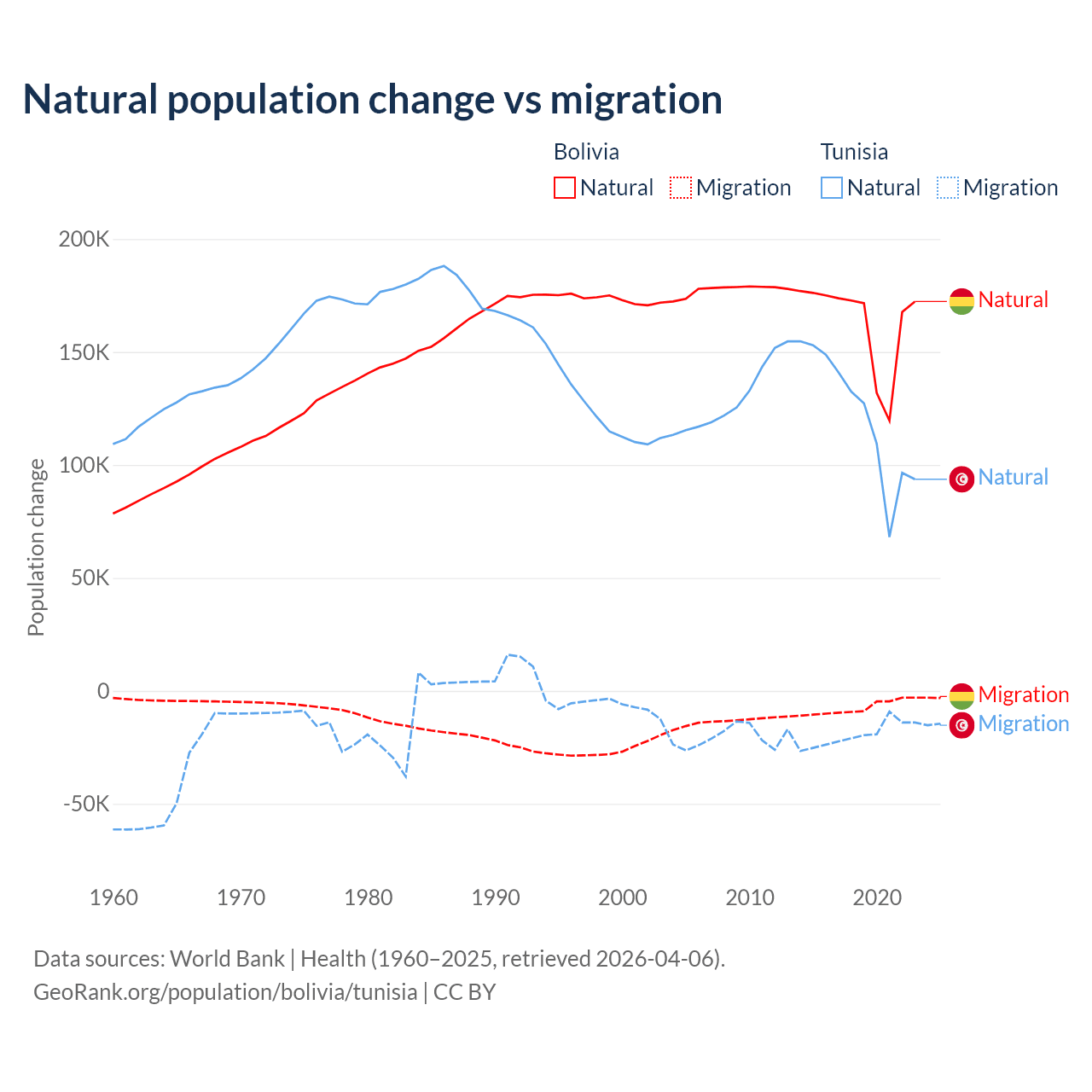 Over the last 10 years, 95.6% of the population change in Bolivia is from natural causes (a gain of 1,637,833 people) and 4.37% is from migration (a loss of 74,903 people). In Tunisia 86.3% is from natural causes (a gain of 1,225,079 people) and 13.7% is from migration (a loss of 195,011 people).