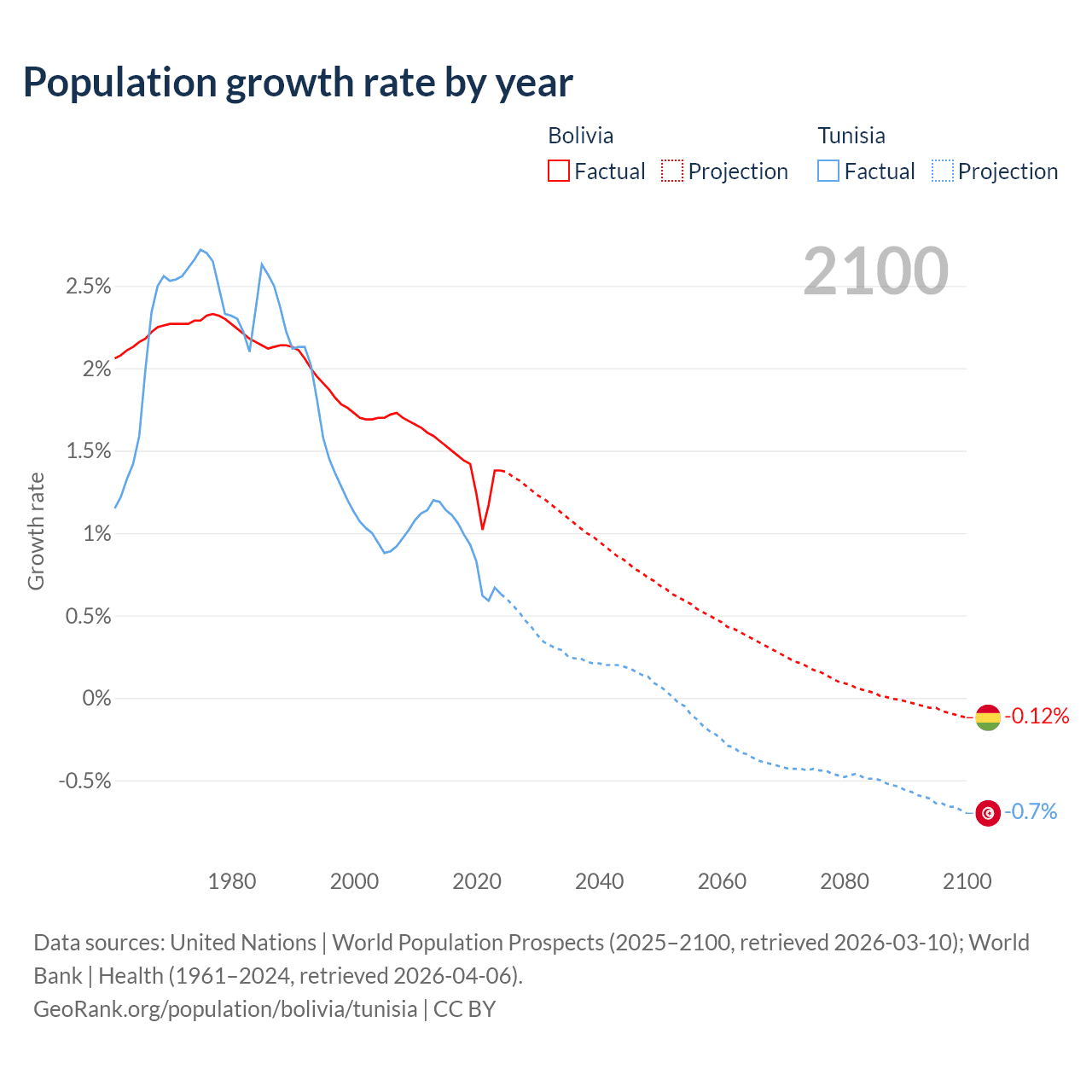 - For the last 10 years, Bolivia has had an average growth rate of +1.37% per year vs +0.89% in Tunisia.