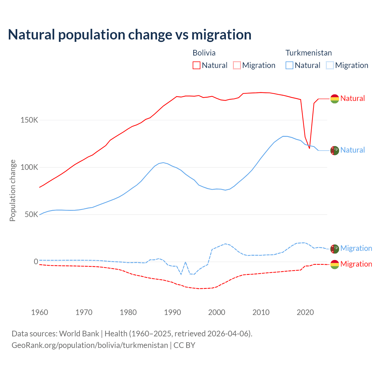 Over the last 10 years, 95.6% of the population change in Bolivia is from natural causes (a gain of 1,637,833 people) and 4.37% is from migration (a loss of 74,903 people). In Turkmenistan 89.2% is from natural causes (a gain of 1,270,228 people) and 10.8% is from migration (a gain of 154,379 people).