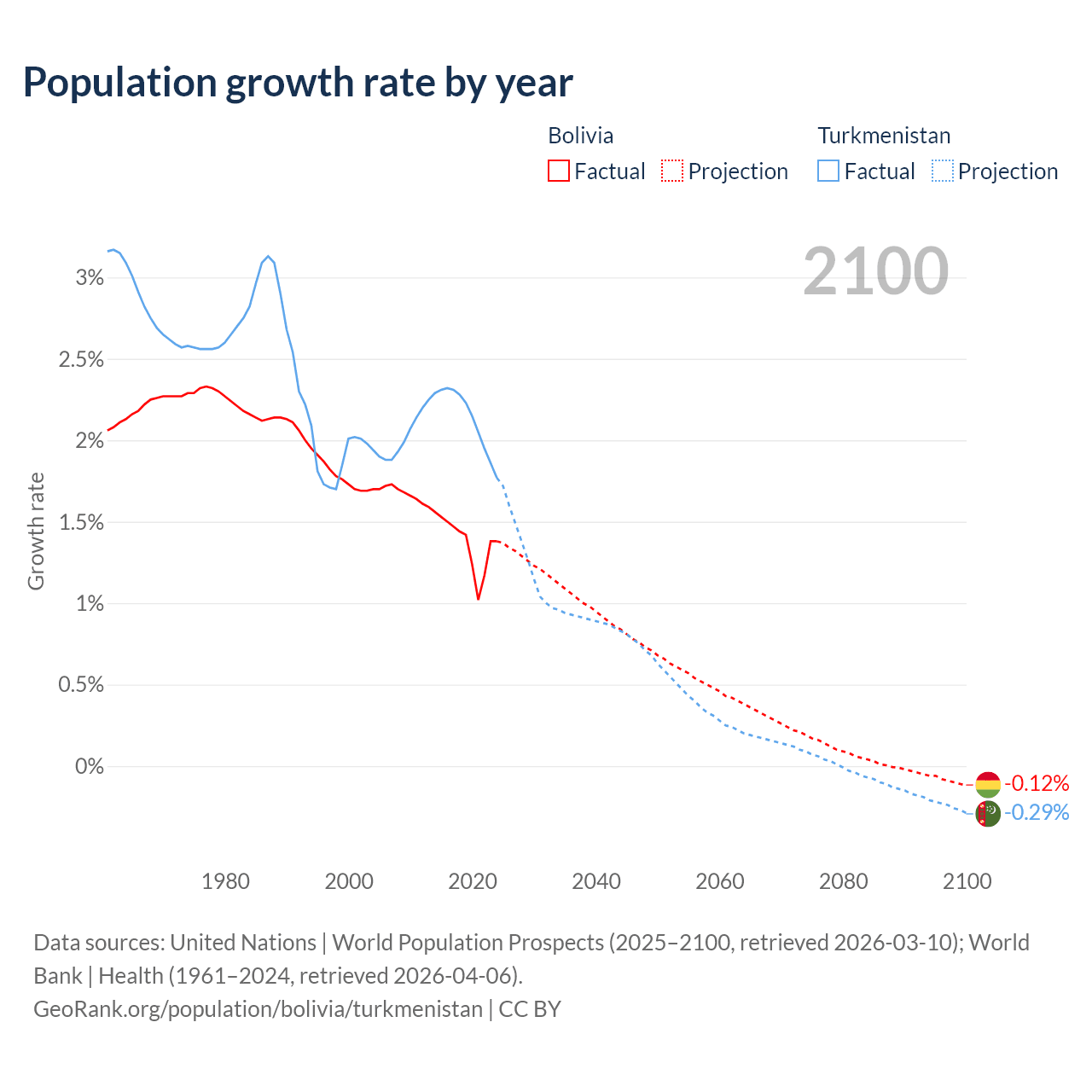 - For the last 10 years, Bolivia has had an average growth rate of +1.37% per year vs +2.14% in Turkmenistan.