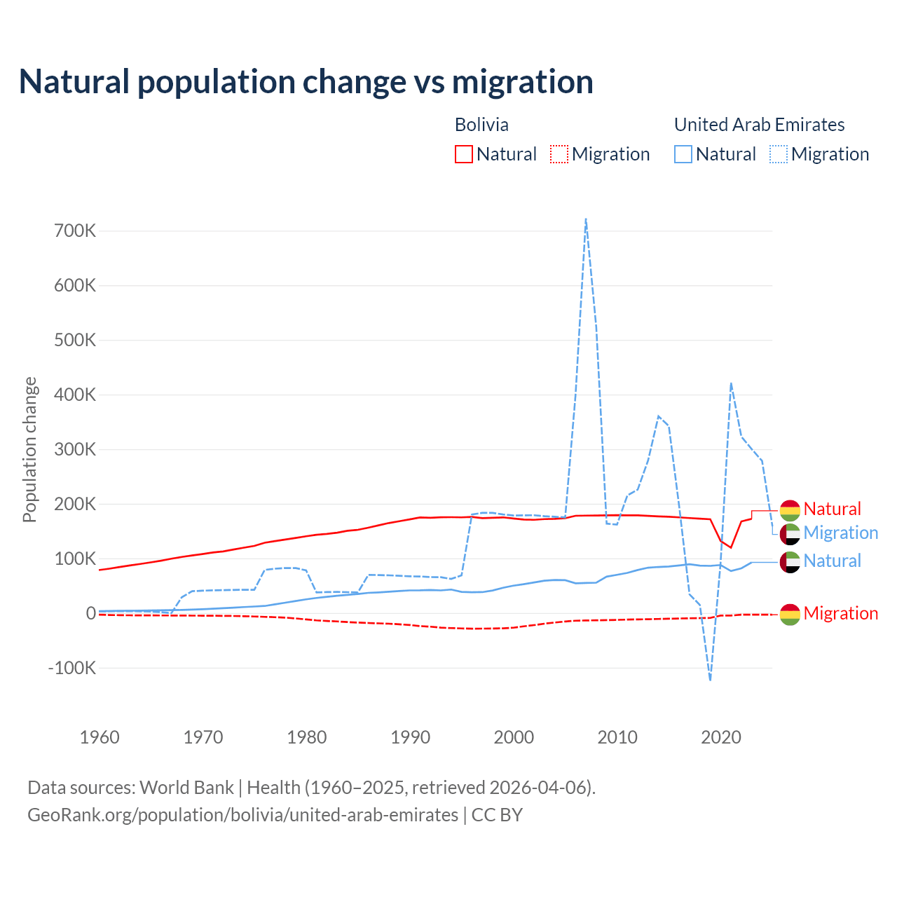 Over the last 10 years, 95.6% of the population change in Bolivia is from natural causes (a gain of 1,637,833 people) and 4.37% is from migration (a loss of 74,903 people). In the United Arab Emirates 30.5% is from natural causes (a gain of 857,996 people) and 69.5% is from migration (a gain of 1,958,520 people).