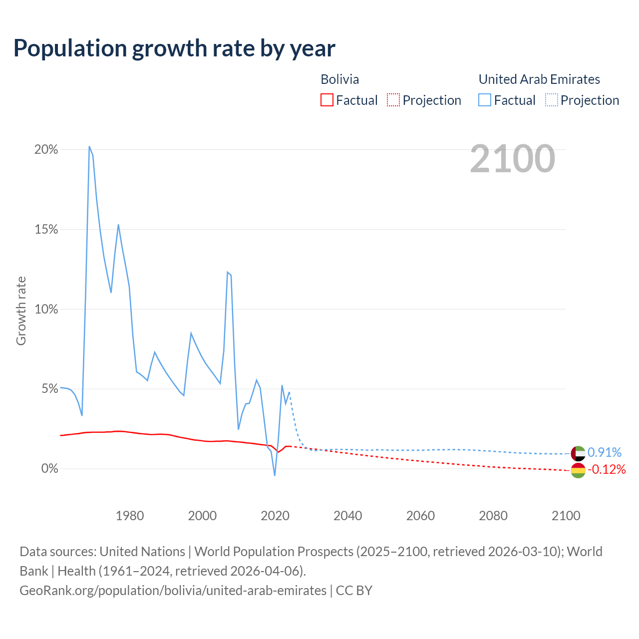 - For the last 10 years, Bolivia has had an average growth rate of +1.37% per year vs +3.31% in the United Arab Emirates.
