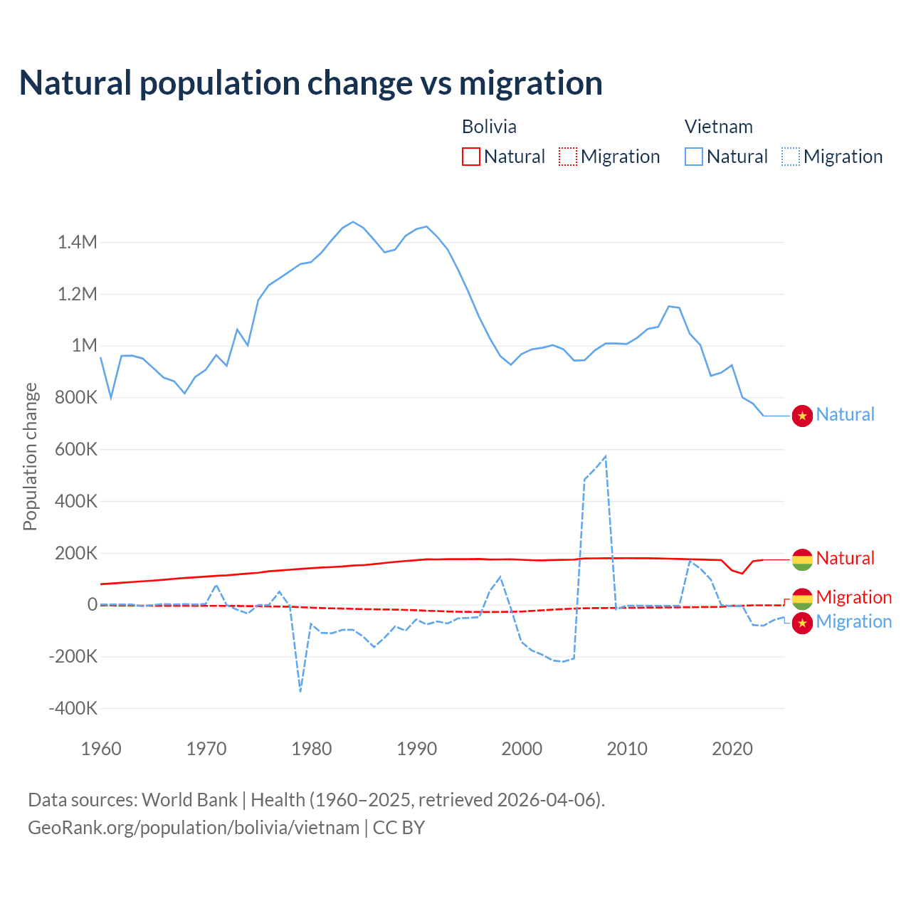 Over the last 10 years, 95.6% of the population change in Bolivia is from natural causes (a gain of 1,637,833 people) and 4.37% is from migration (a loss of 74,903 people). In Vietnam 97.7% is from natural causes (a gain of 9,349,756 people) and 2.29% is from migration (a gain of 219,073 people).