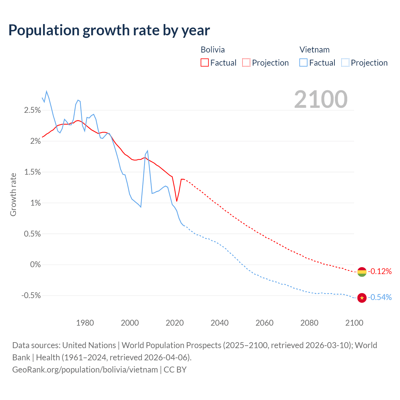 - For the last 10 years, Bolivia has had an average growth rate of +1.37% per year vs +0.99% in Vietnam.