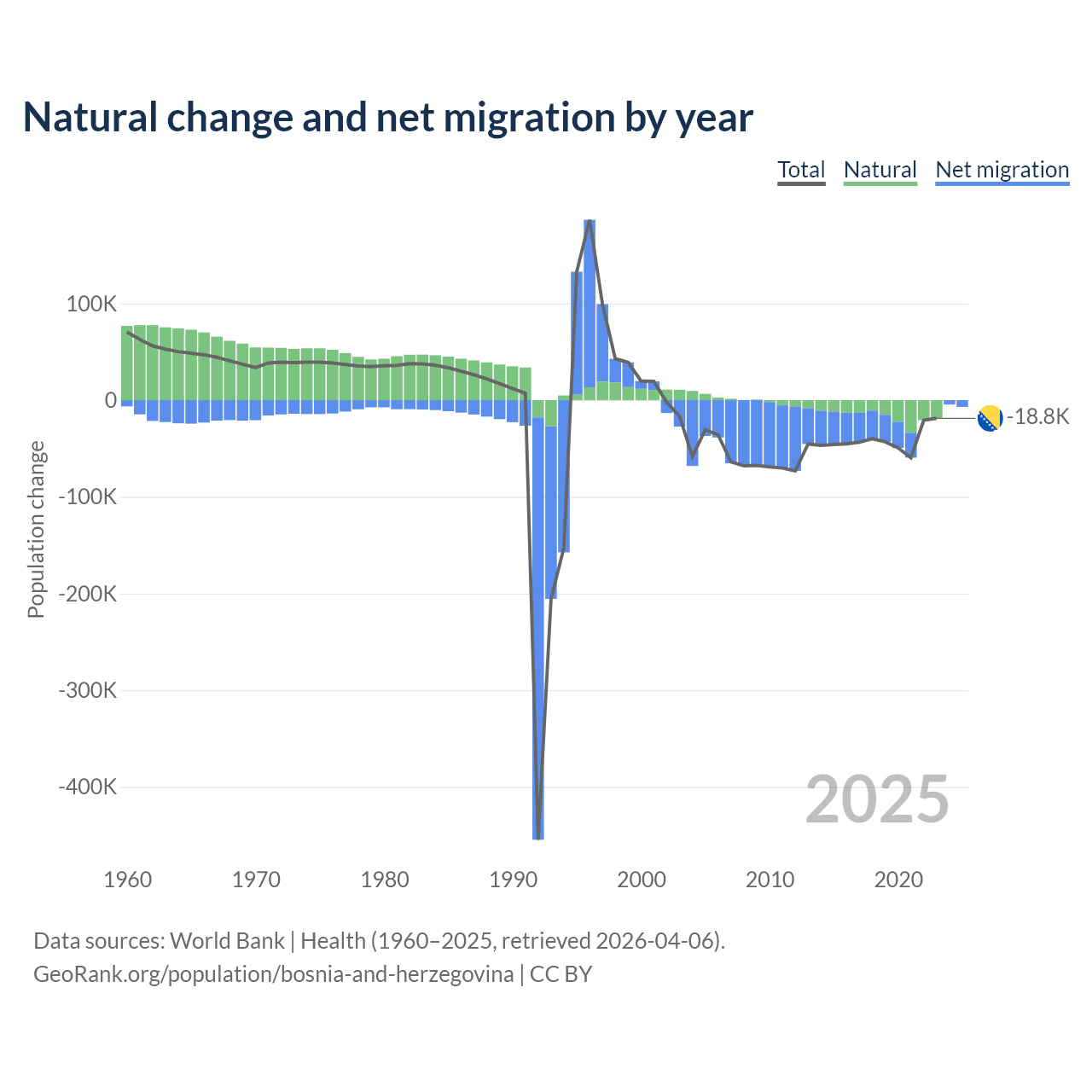 Over the last 10 years, 41.1% of the population change in Bosnia and Herzegovina is from natural causes (a loss of 169,384 people) and 58.9% is from migration (a loss of 243,117 people).