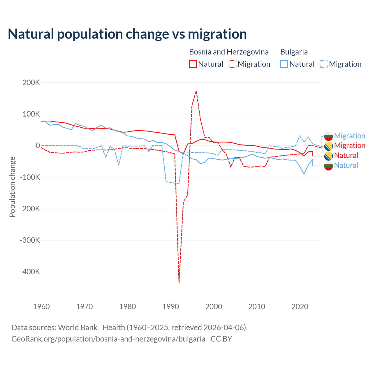 Over the last 10 years, 41.1% of the population change in Bosnia and Herzegovina is from natural causes (a loss of 169,384 people) and 58.9% is from migration (a loss of 243,117 people). In Bulgaria 92.1% is from natural causes (a loss of 528,535 people) and 7.94% is from migration (a gain of 45,567 people).