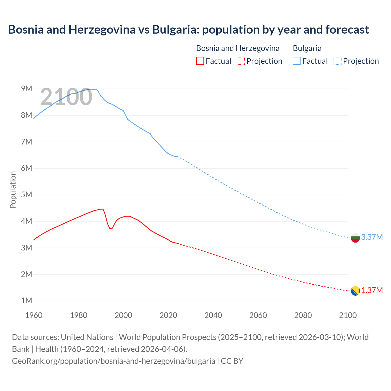The latest officially reported population of Bosnia and Herzegovina was 3,164,253 in 2024 vs 6,441,421 people in Bulgaria in 2024. In 2026, based on the adjusted UN estimation, the current Bosnia and Herzegovina's population is 3,116,111 people compared to 6,359,449 in Bulgaria.