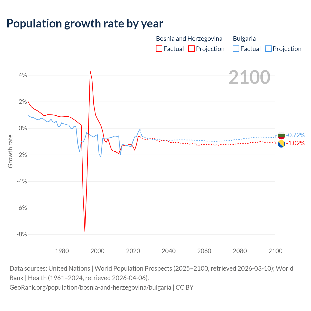 - For the last 10 years, Bosnia and Herzegovina has had an average growth rate of -1.19% per year vs -0.96% in Bulgaria.