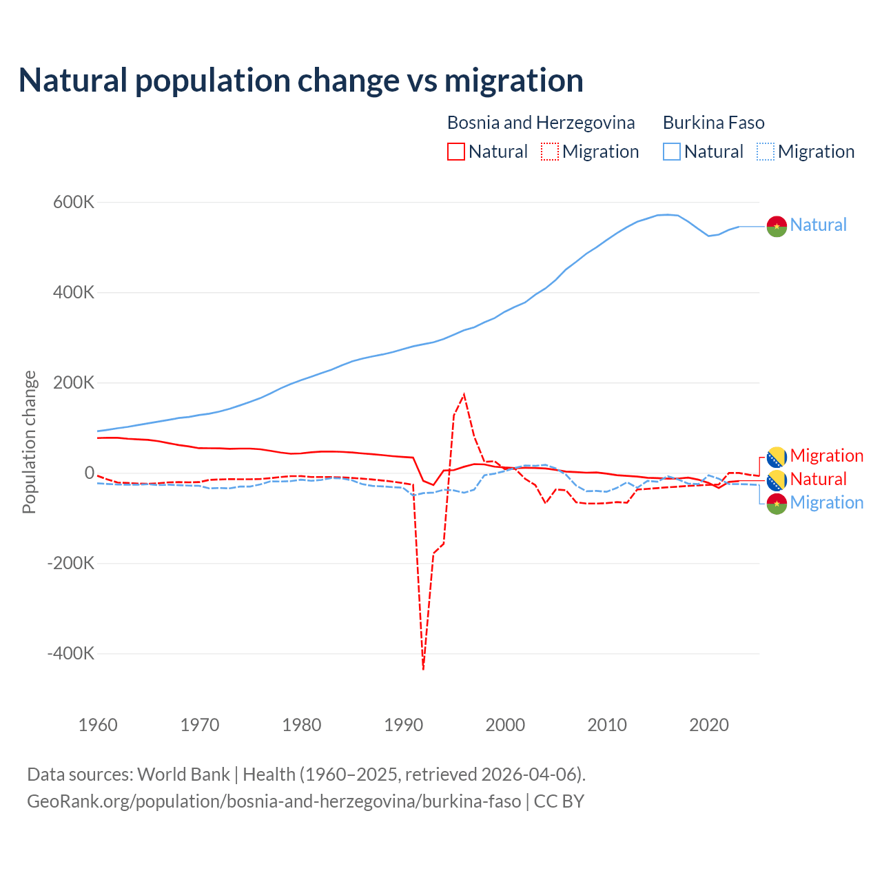 Over the last 10 years, 41.1% of the population change in Bosnia and Herzegovina is from natural causes (a loss of 169,384 people) and 58.9% is from migration (a loss of 243,117 people). In Burkina Faso 96.9% is from natural causes (a gain of 5,506,960 people) and 3.13% is from migration (a loss of 177,923 people).