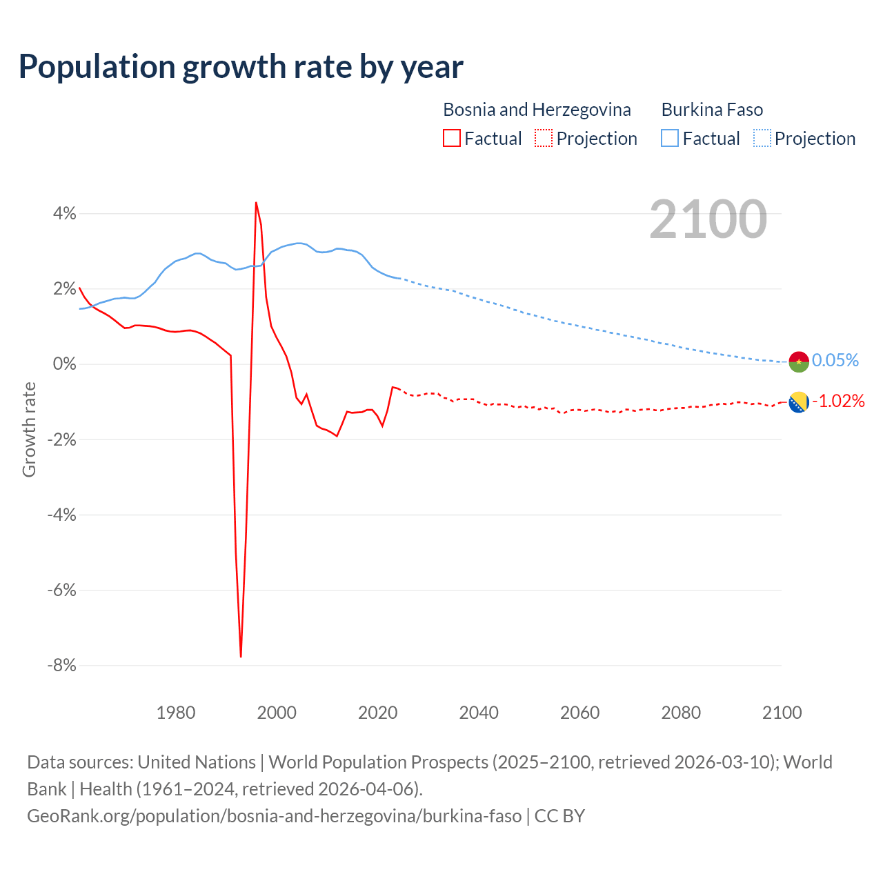- For the last 10 years, Bosnia and Herzegovina has had an average growth rate of -1.19% per year vs +2.63% in Burkina Faso.