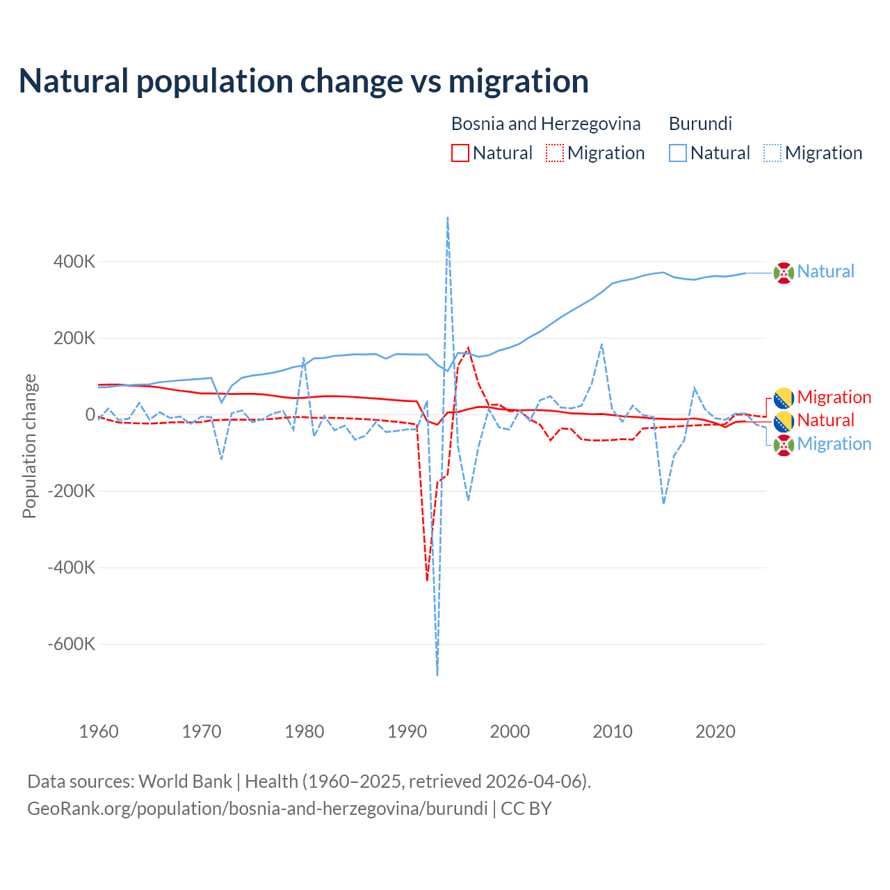 Over the last 10 years, 41.1% of the population change in Bosnia and Herzegovina is from natural causes (a loss of 169,384 people) and 58.9% is from migration (a loss of 243,117 people). In Burundi 91% is from natural causes (a gain of 3,614,502 people) and 9.03% is from migration (a loss of 358,928 people).