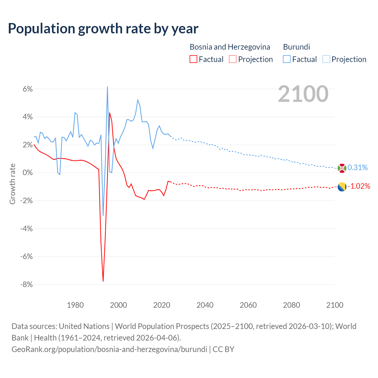 - For the last 10 years, Bosnia and Herzegovina has had an average growth rate of -1.19% per year vs +2.74% in Burundi.