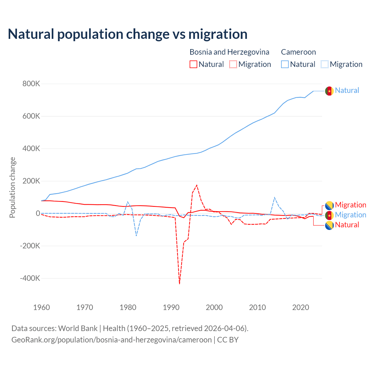 Over the last 10 years, 41.1% of the population change in Bosnia and Herzegovina is from natural causes (a loss of 169,384 people) and 58.9% is from migration (a loss of 243,117 people). In Cameroon 99.1% is from natural causes (a gain of 6,982,395 people) and 0.9% is from migration (a gain of 63,139 people).