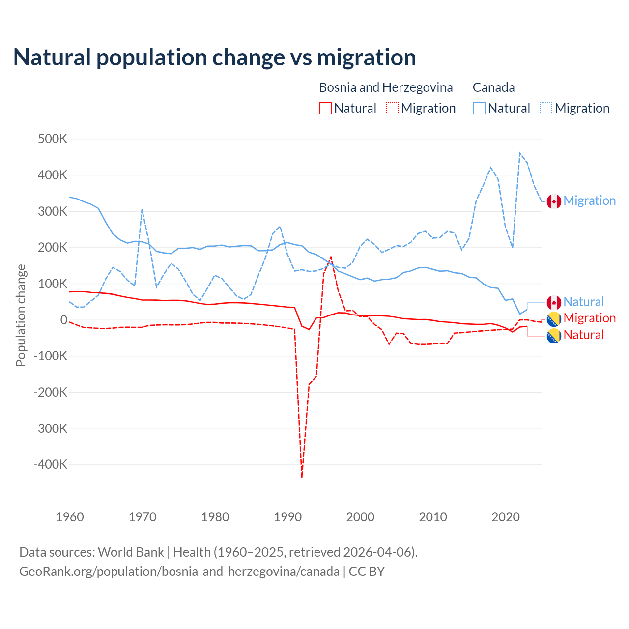 Over the last 10 years, 41.1% of the population change in Bosnia and Herzegovina is from natural causes (a loss of 169,384 people) and 58.9% is from migration (a loss of 243,117 people). In Canada 19.4% is from natural causes (a gain of 789,345 people) and 80.6% is from migration (a gain of 3,276,554 people).