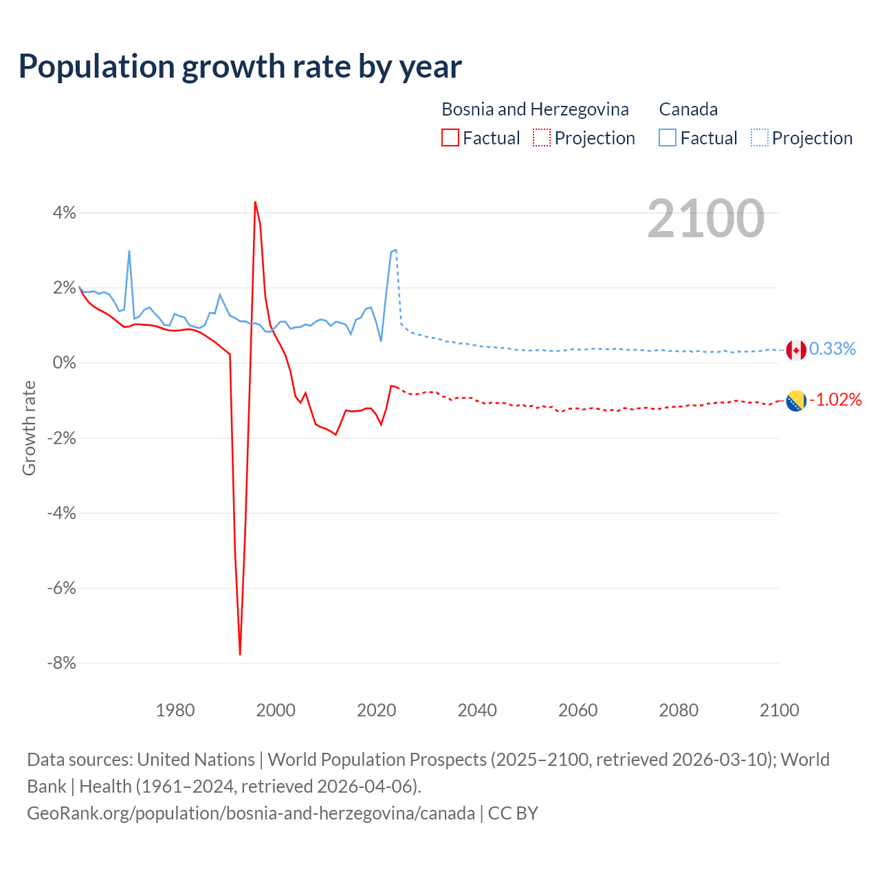 - For the last 10 years, Bosnia and Herzegovina has had an average growth rate of -1.19% per year vs +1.5% in Canada.