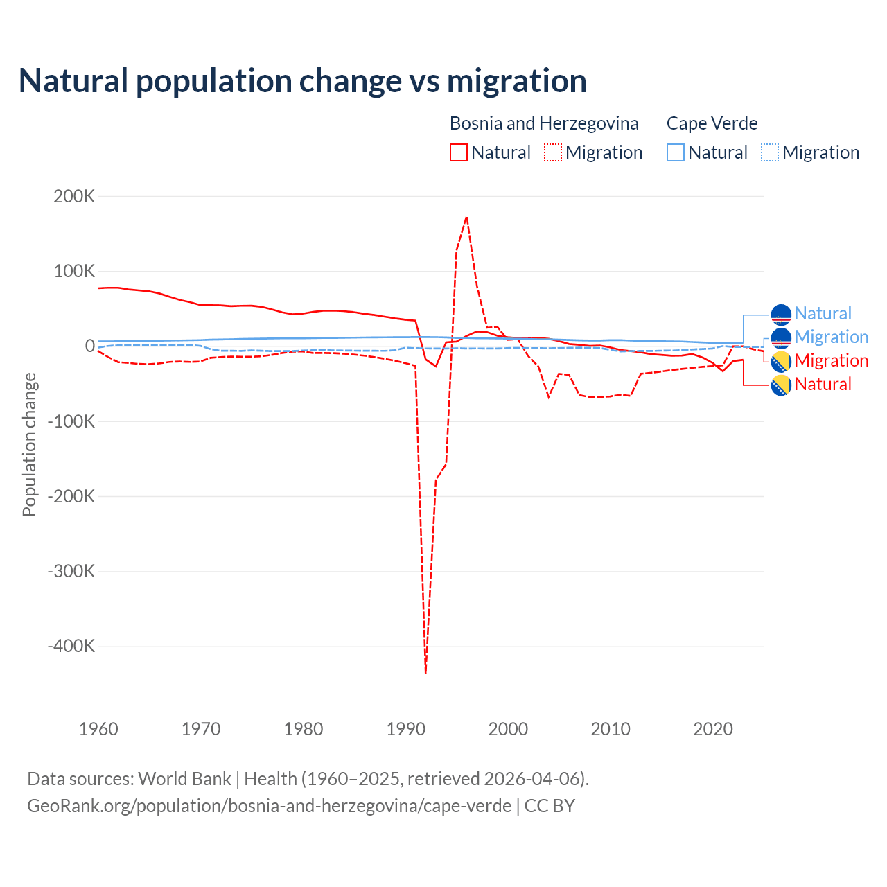 Over the last 10 years, 41.1% of the population change in Bosnia and Herzegovina is from natural causes (a loss of 169,384 people) and 58.9% is from migration (a loss of 243,117 people). In Cape Verde 56.4% is from natural causes (a gain of 50,193 people) and 43.6% is from migration (a loss of 38,879 people).