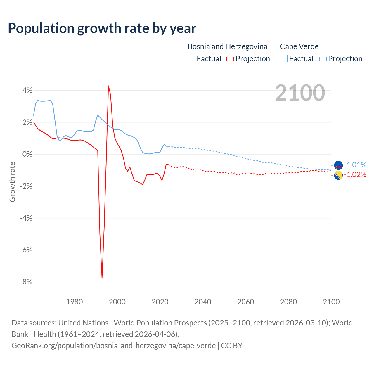 - For the last 10 years, Bosnia and Herzegovina has had an average growth rate of -1.19% per year vs +0.22% in Cape Verde.