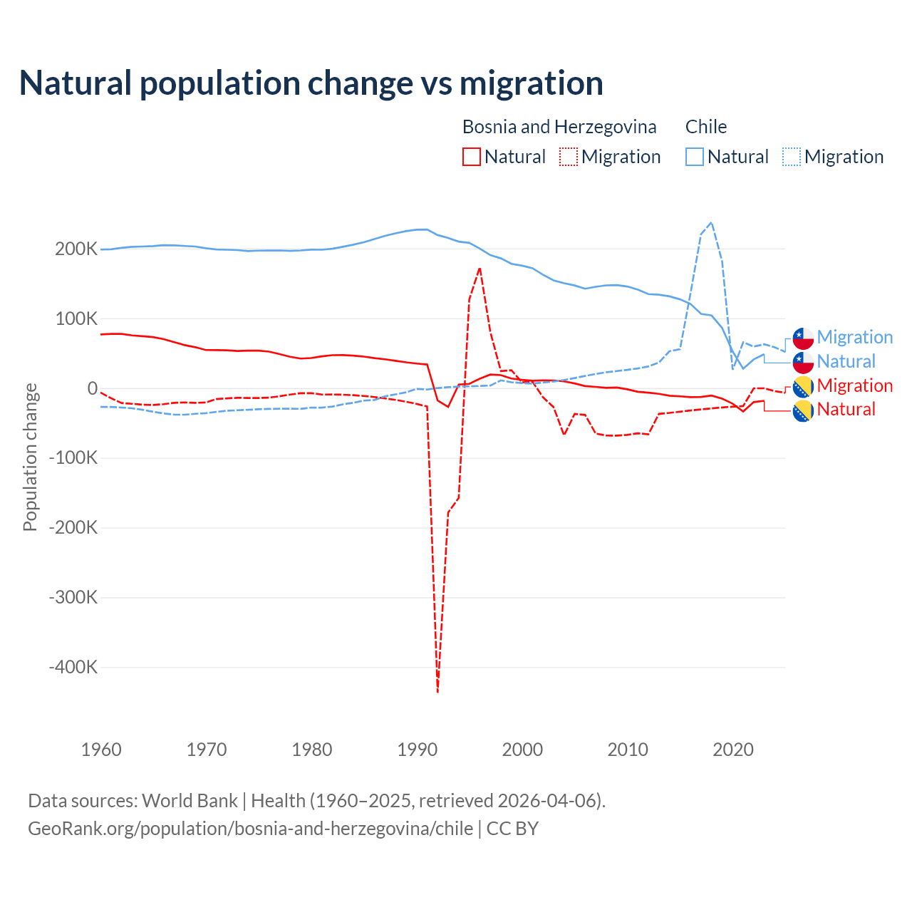 Over the last 10 years, 41.1% of the population change in Bosnia and Herzegovina is from natural causes (a loss of 169,384 people) and 58.9% is from migration (a loss of 243,117 people). In Chile 43.5% is from natural causes (a gain of 844,683 people) and 56.5% is from migration (a gain of 1,097,597 people).