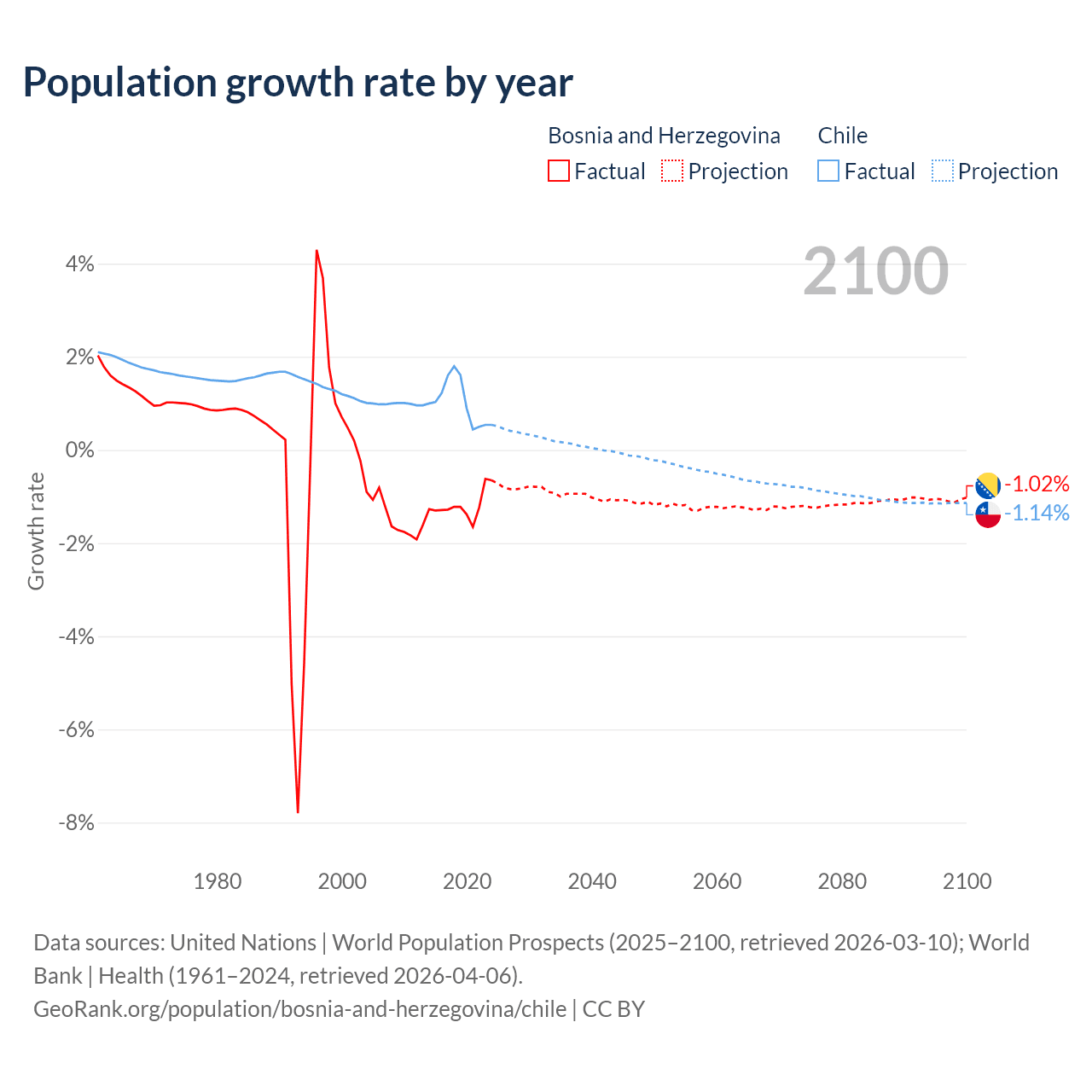 - For the last 10 years, Bosnia and Herzegovina has had an average growth rate of -1.19% per year vs +1.02% in Chile.