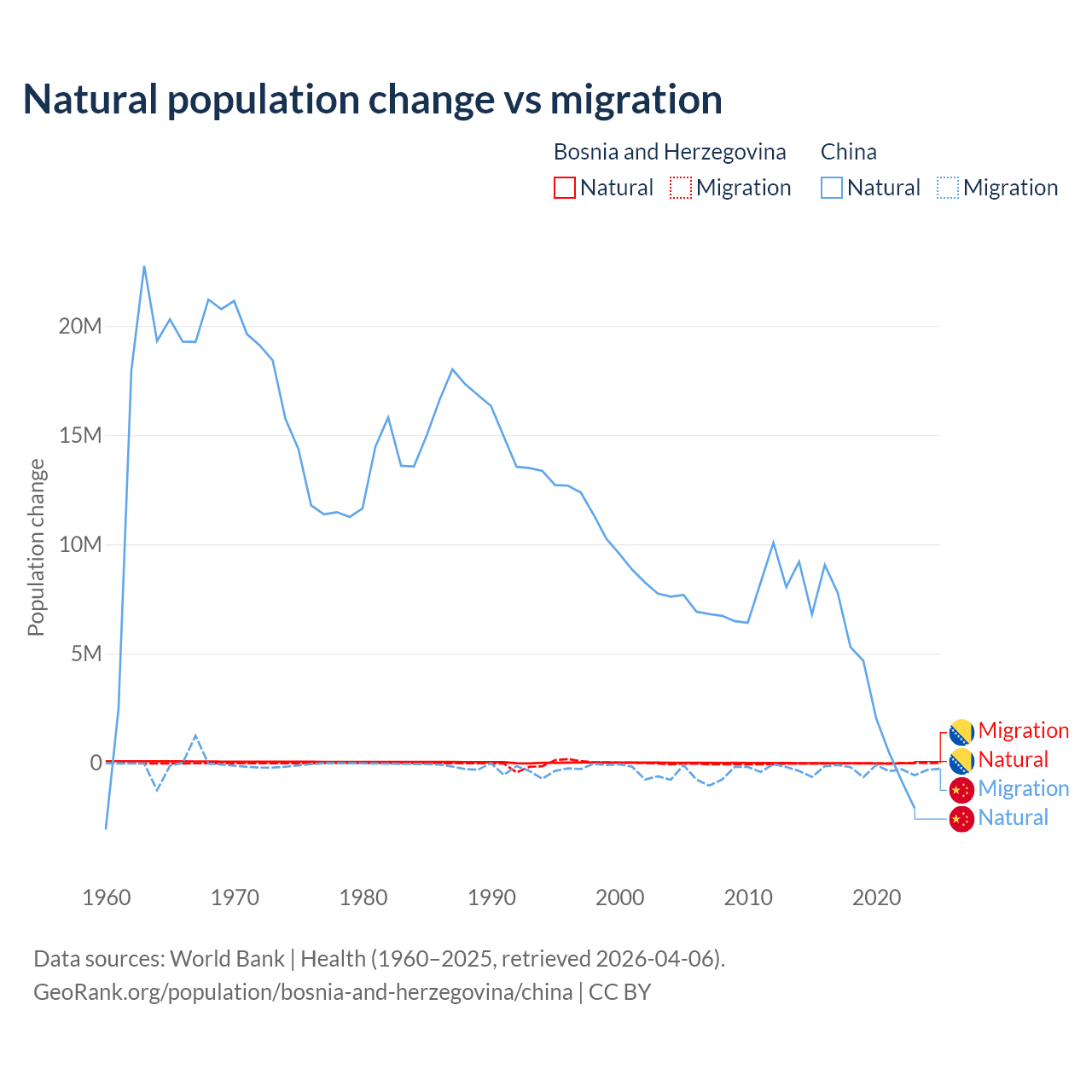 Over the last 10 years, 41.1% of the population change in Bosnia and Herzegovina is from natural causes (a loss of 169,384 people) and 58.9% is from migration (a loss of 243,117 people). In China 92.5% is from natural causes (a gain of 42,414,528 people) and 7.53% is from migration (a loss of 3,452,923 people).