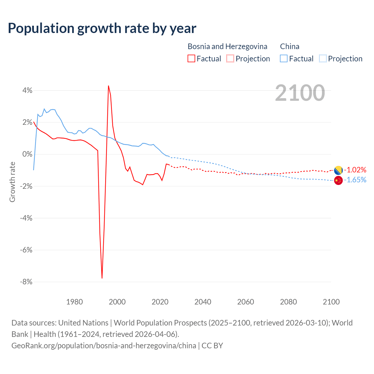 - For the last 10 years, Bosnia and Herzegovina has had an average growth rate of -1.19% per year vs +0.3% in China.