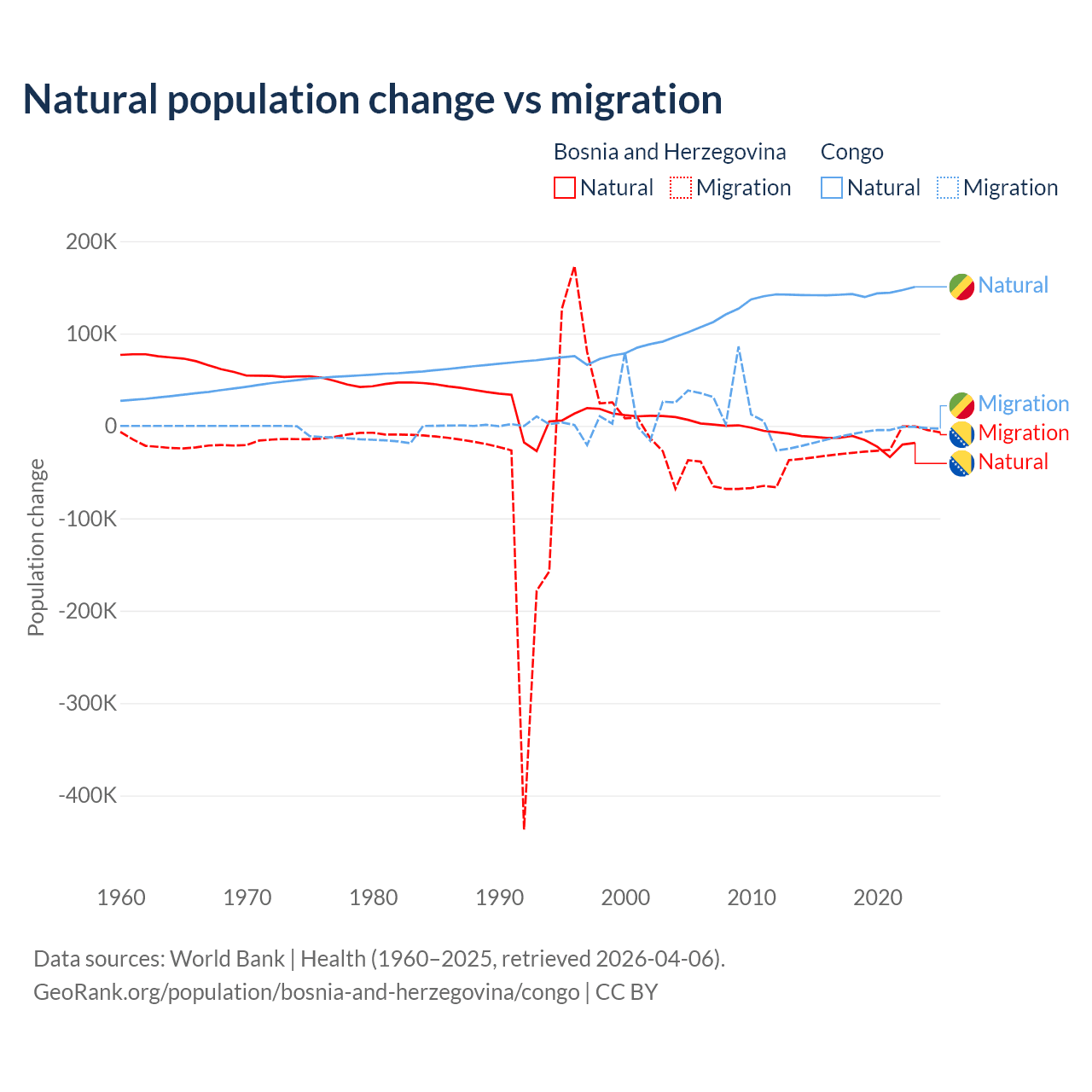 Over the last 10 years, 41.1% of the population change in Bosnia and Herzegovina is from natural causes (a loss of 169,384 people) and 58.9% is from migration (a loss of 243,117 people). In the Congo 94% is from natural causes (a gain of 1,434,056 people) and 6.04% is from migration (a loss of 92,251 people).