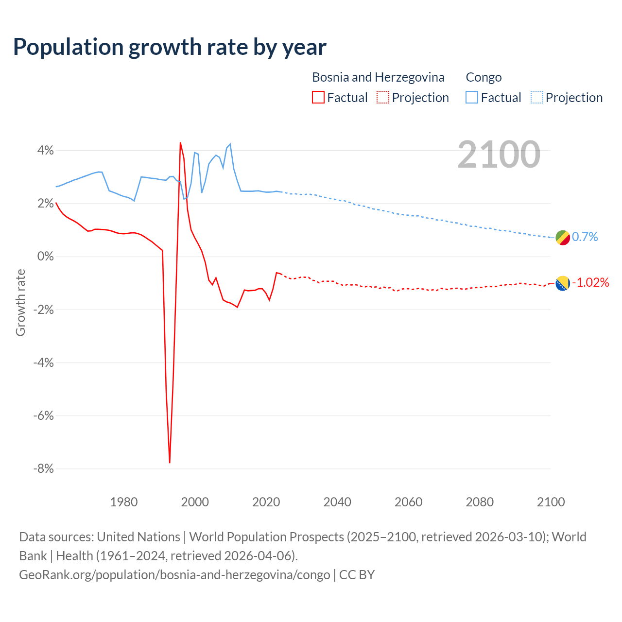 - For the last 10 years, Bosnia and Herzegovina has had an average growth rate of -1.19% per year vs +2.44% in the Congo.