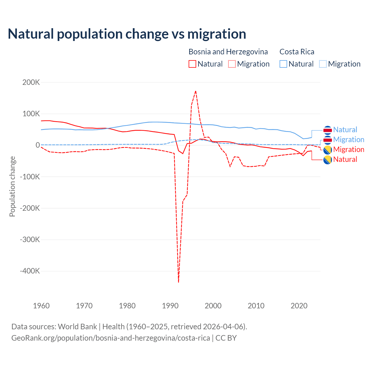 Over the last 10 years, 41.1% of the population change in Bosnia and Herzegovina is from natural causes (a loss of 169,384 people) and 58.9% is from migration (a loss of 243,117 people). In Costa Rica 96.3% is from natural causes (a gain of 362,624 people) and 3.69% is from migration (a gain of 13,900 people).