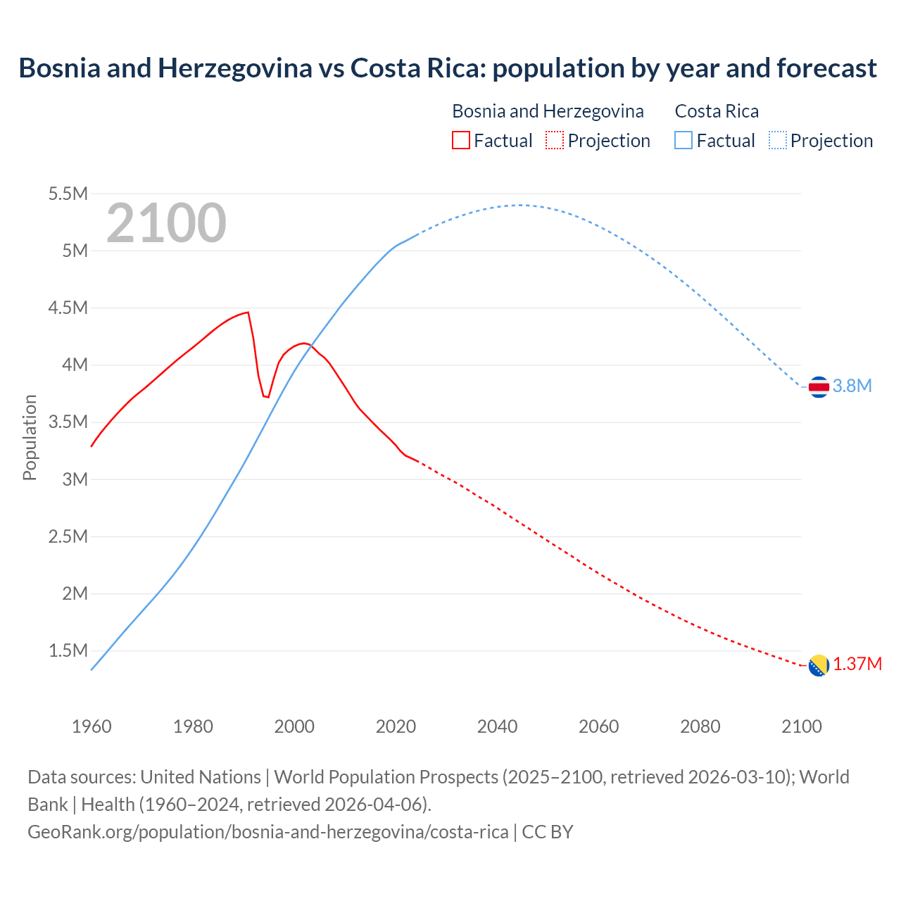 The latest officially reported population of Bosnia and Herzegovina was 3,164,253 in 2024 vs 5,129,910 people in Costa Rica in 2024. In 2026, based on the adjusted UN estimation, the current Bosnia and Herzegovina's population is 3,116,111 people compared to 5,181,862 in Costa Rica.